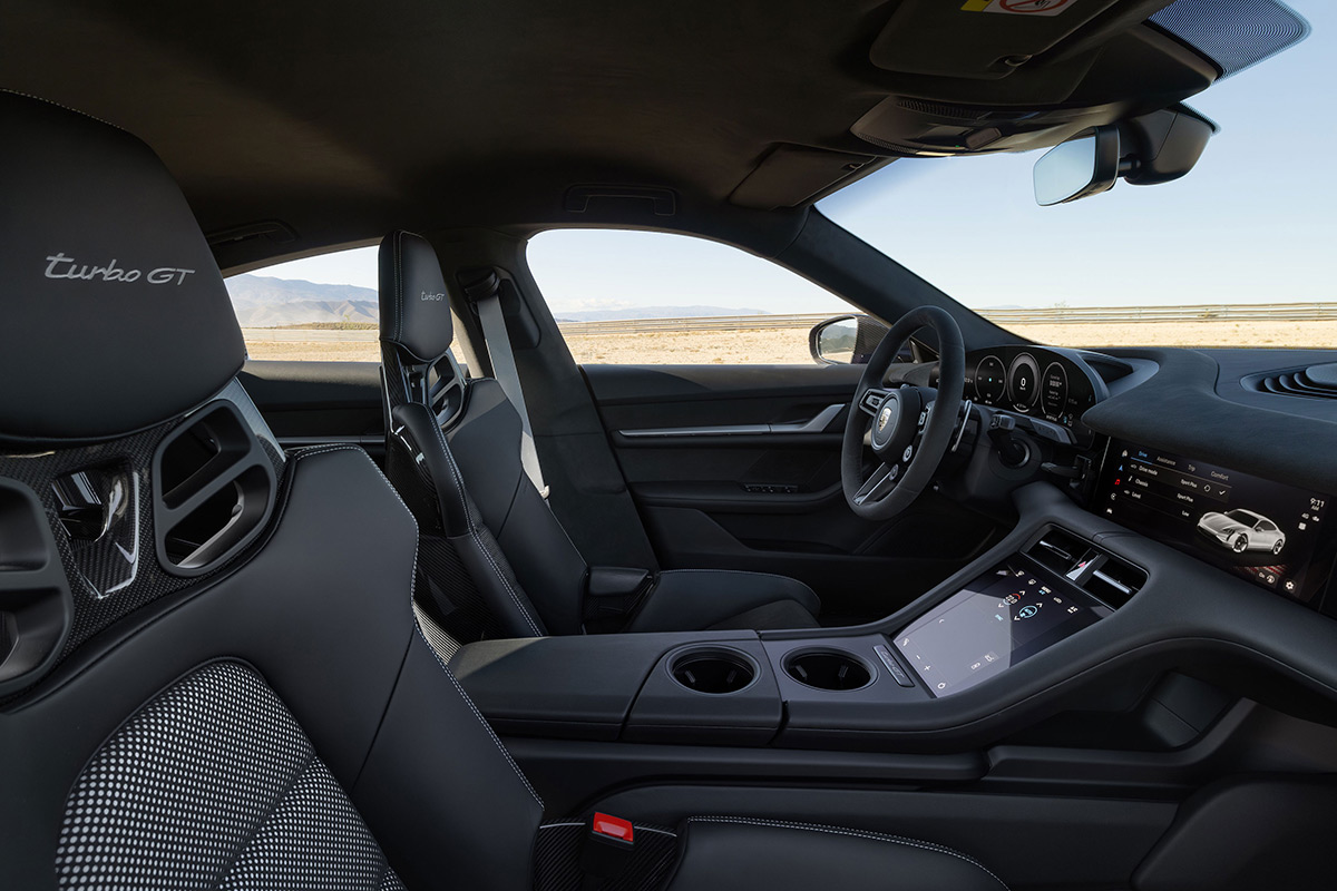 Eliminating all equipment not required for track driving has shaved off roughly 157 lbs. compared to the Taycan Turbo S. Instead of the usual rear seat system, there is a tailor-made, high-quality lightweight carbon fiber cladding with a storage compartment behind the driver and front passenger seats. The analog clock from the Sport Chrono Package, which is normally present on the instrument panel, is also dispensed with, as are the floor and trunk mats and less insulation material is used. The Taycan Turbo GT with Weissach Package only has a charge port door on the passenger side, which is operated manually instead of electrically. Special sound- and heat-insulating glass and the Sound Package Plus also save weight. The latter does without rear speakers and replaces the BOSE Surround Sound system found standard in the Turbo GT.