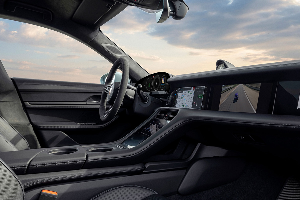 On the GT Sport steering wheel, the rim is covered with black Race-Tex and has a 12 o’clock marking. The Taycan Turbo GT features the Sport Chrono package from the Taycan Turbo S.