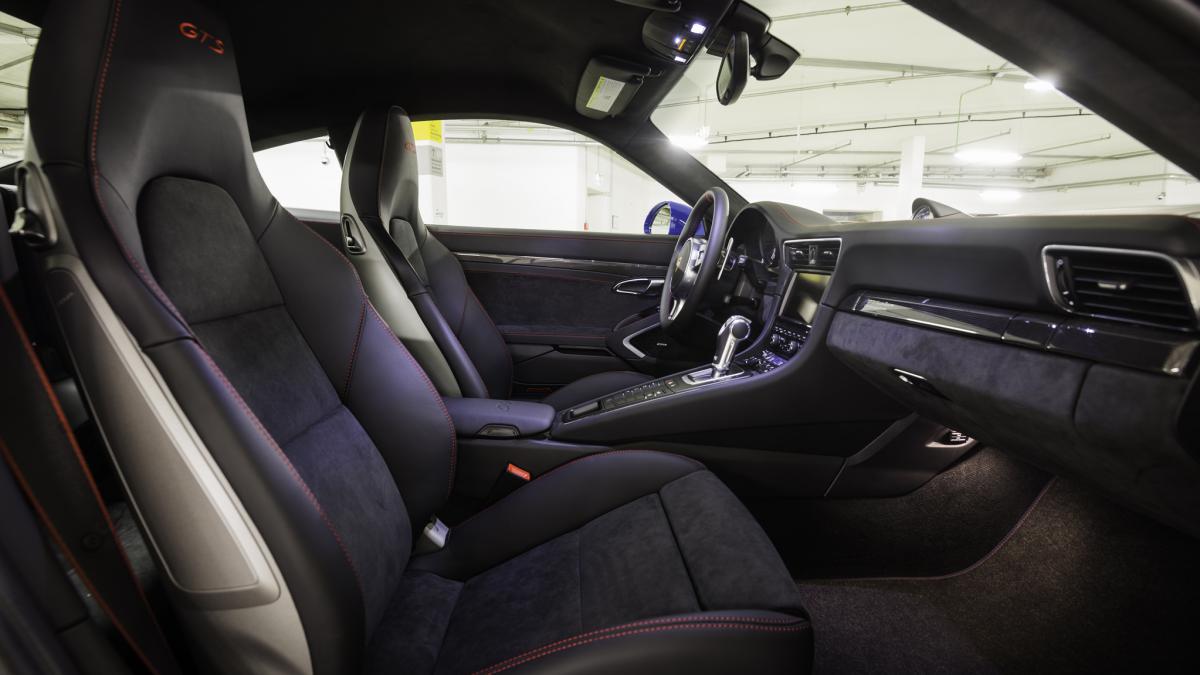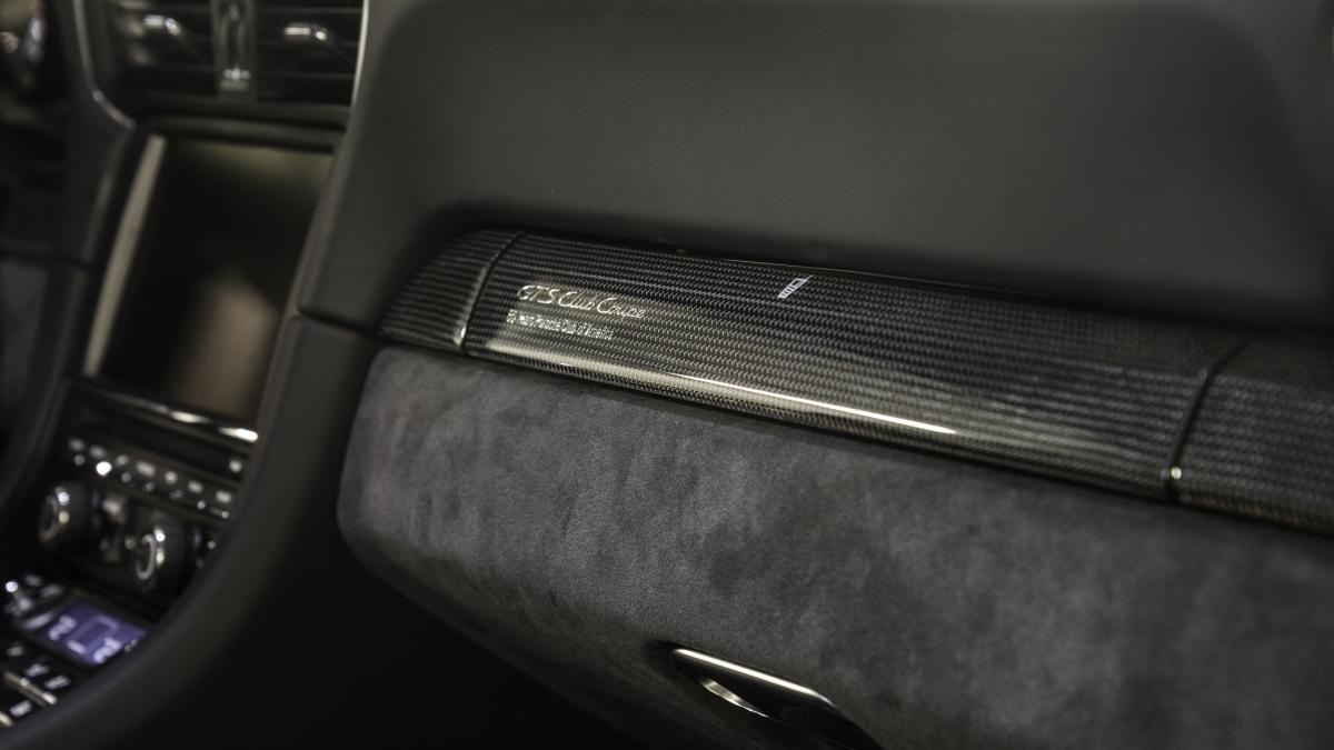 The interior is highlighted by the GTS Interior Package. The stitching, seat belts, and rev counter are held in contrasting Carmine Red, while the dashboard trim strips, door trim and center console are finished in carbon fiber. The striking steering wheel has a Red 12 o’clock marker and two-tone stitching in Carmine Red and Blue. The center compartment lid is embossed with a “60” and the dashboard trim is personalized with “GTS Club Coupe 60 Years Porsche Club of America” lettering above the glove compartment. Stainless steel door sills which read “GTS Club Coupe” serve as a further distinction.