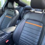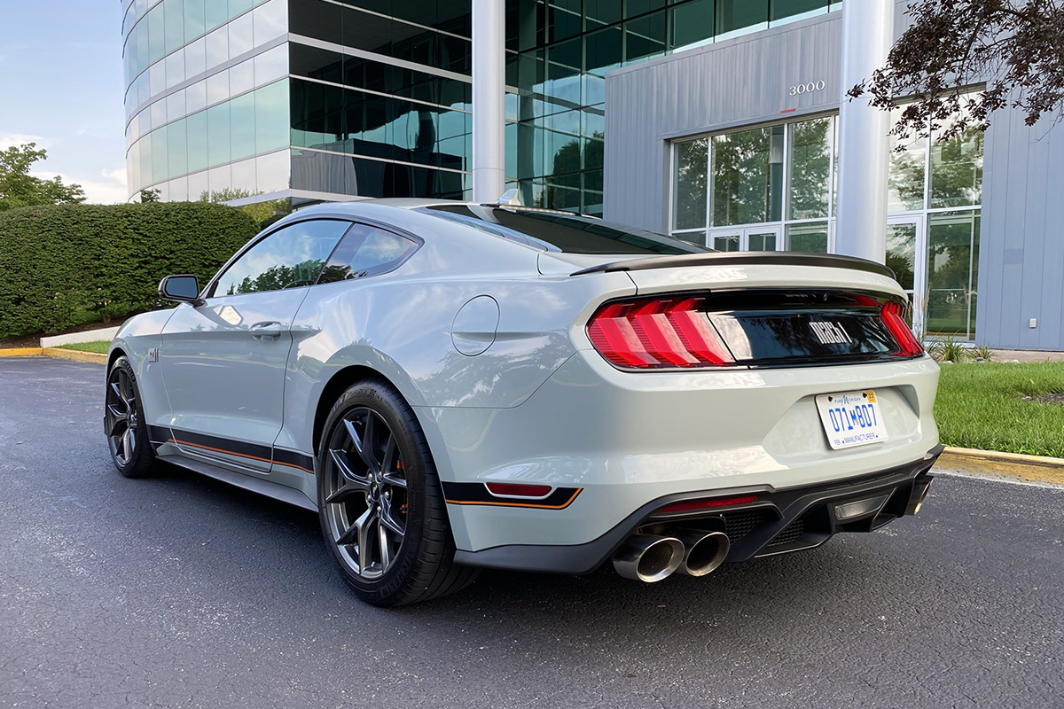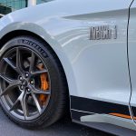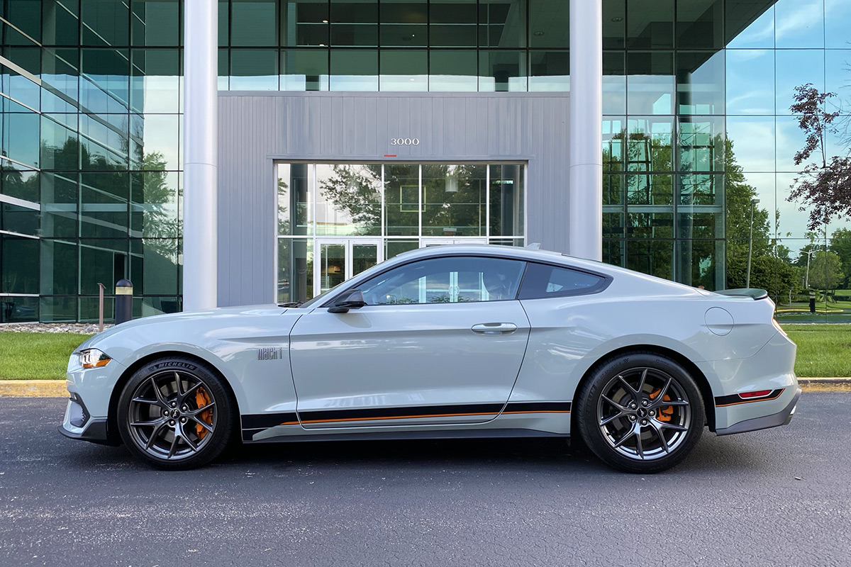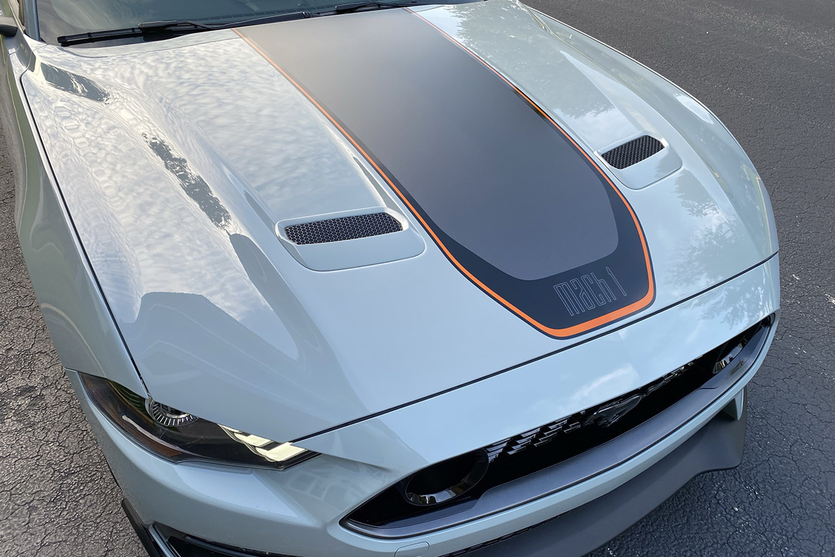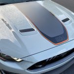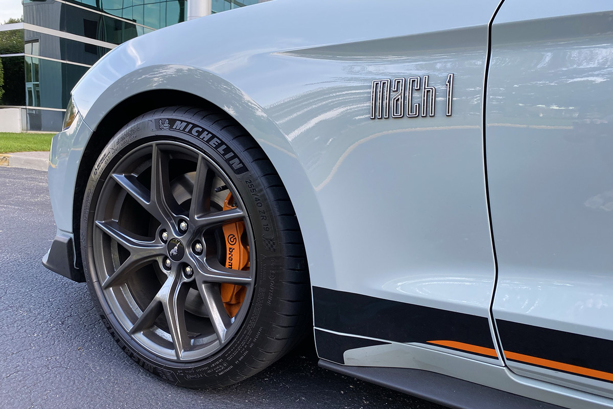Visually, our Mustang Mach 1 tester turned more than a few heads, thanks in part to the Mach 1 exclusive Fighter Jet Gray paint, black/orange hood and side stripes, the unique front grille, the painted 19″ wheels and orange brake calipers, and the aggressive aero pieces. Everything really ties together nicely, the designers really knocked it out of the park.