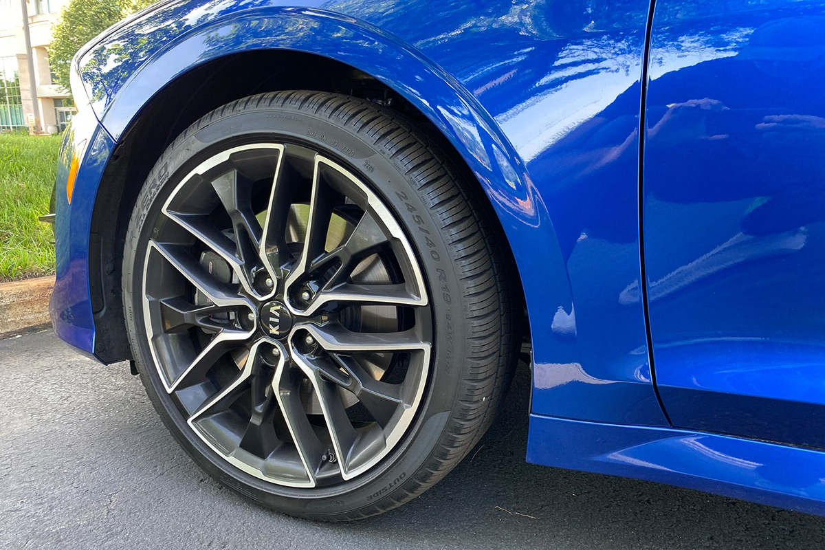 The rear of the car is a bit more restrained, with taillights that run the length of the decklid, a sporty gloss black diffuser, and quad exhaust tips to let people know that this is no ordinary run-of-the-mill K5. Bold 19-inch wheels wrapped in Pirelli P-Zero all-season tires complete the sporty look.