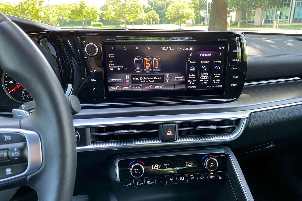 As you can see, the interior of the K5 GT is a huge improvement over the outgoing model, with a 10.25-inch touchscreen infotainment system, heated and ventilated leather seats, a Bose 12-speaker premium sound system, wireless Apple CarPlay and Android Auto, and a host of other goodies. Being the “sports” model, it comes with sport bucket seats, flat-bottom steering wheel (which is heated), and numerous GT logos. It’s a very premium interior.