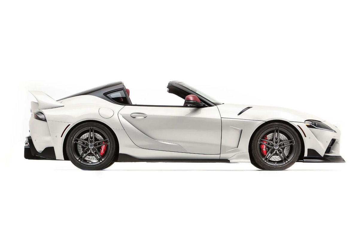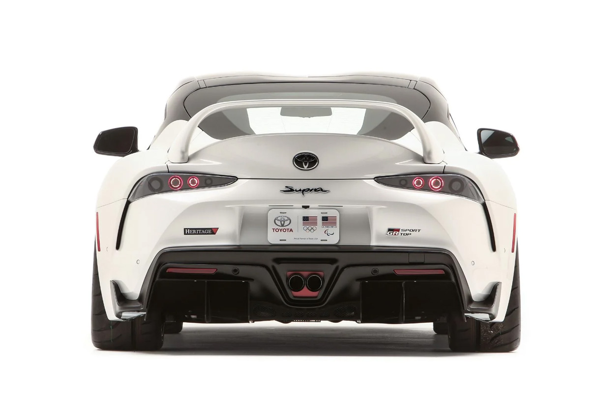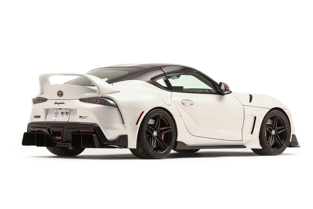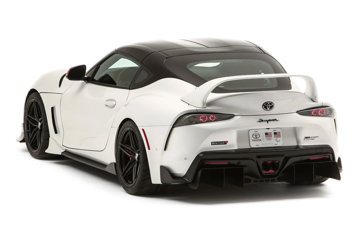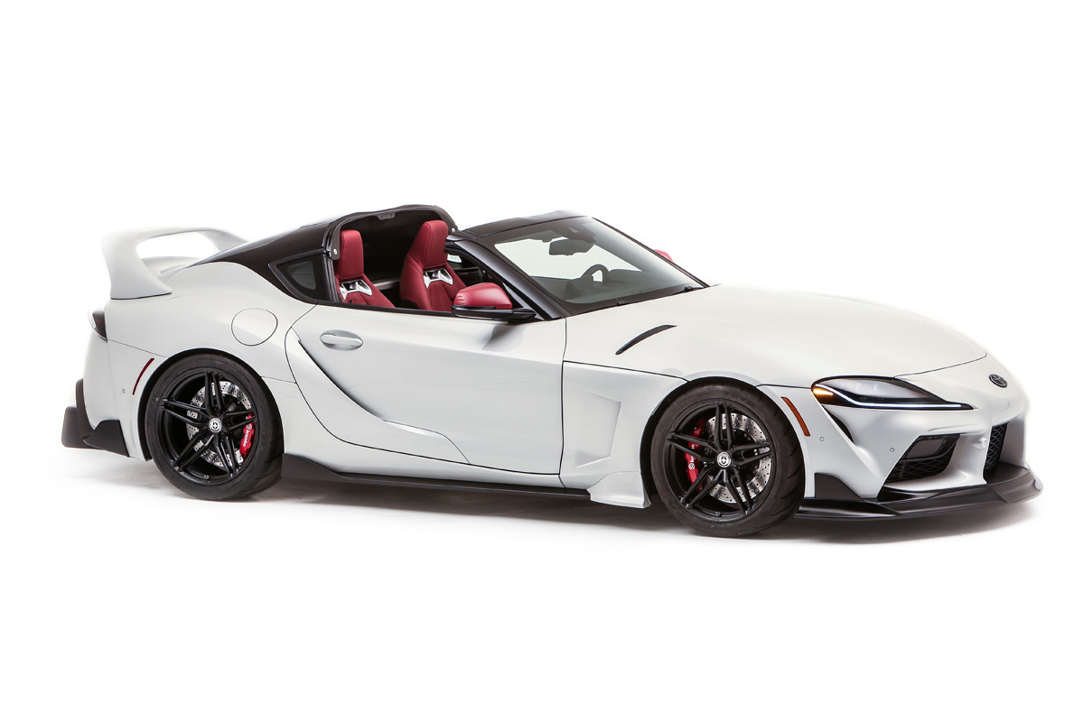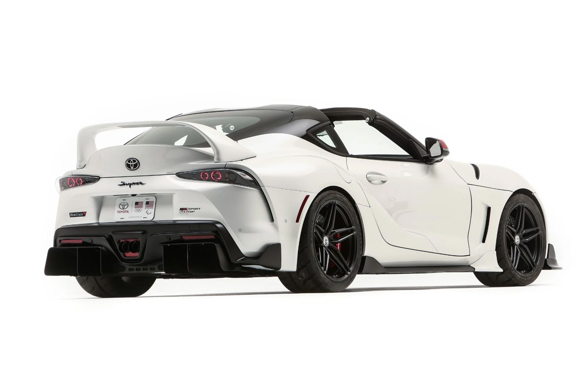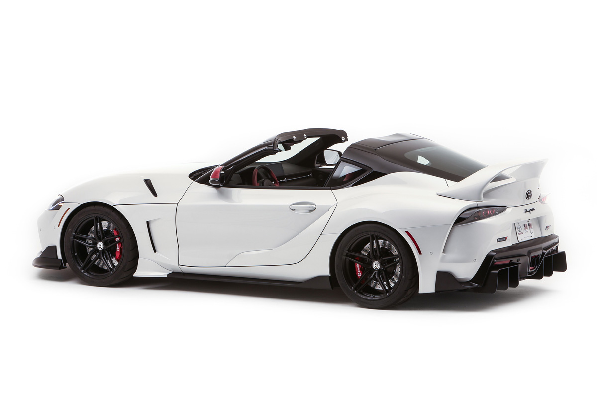 As you can see, the 2021 Supra Sport Top features retro-inspired custom headlights, taillights, an MKIV-style rear wing, a new dual-pipe center exhaust, a hand-built rear diffuser, and HRE wheels. Upgrades such as bigger brakes, tuned engine, turbocharger and ECU, and custom front and rear suspension ensure it performs as spectacularly as it looks.