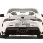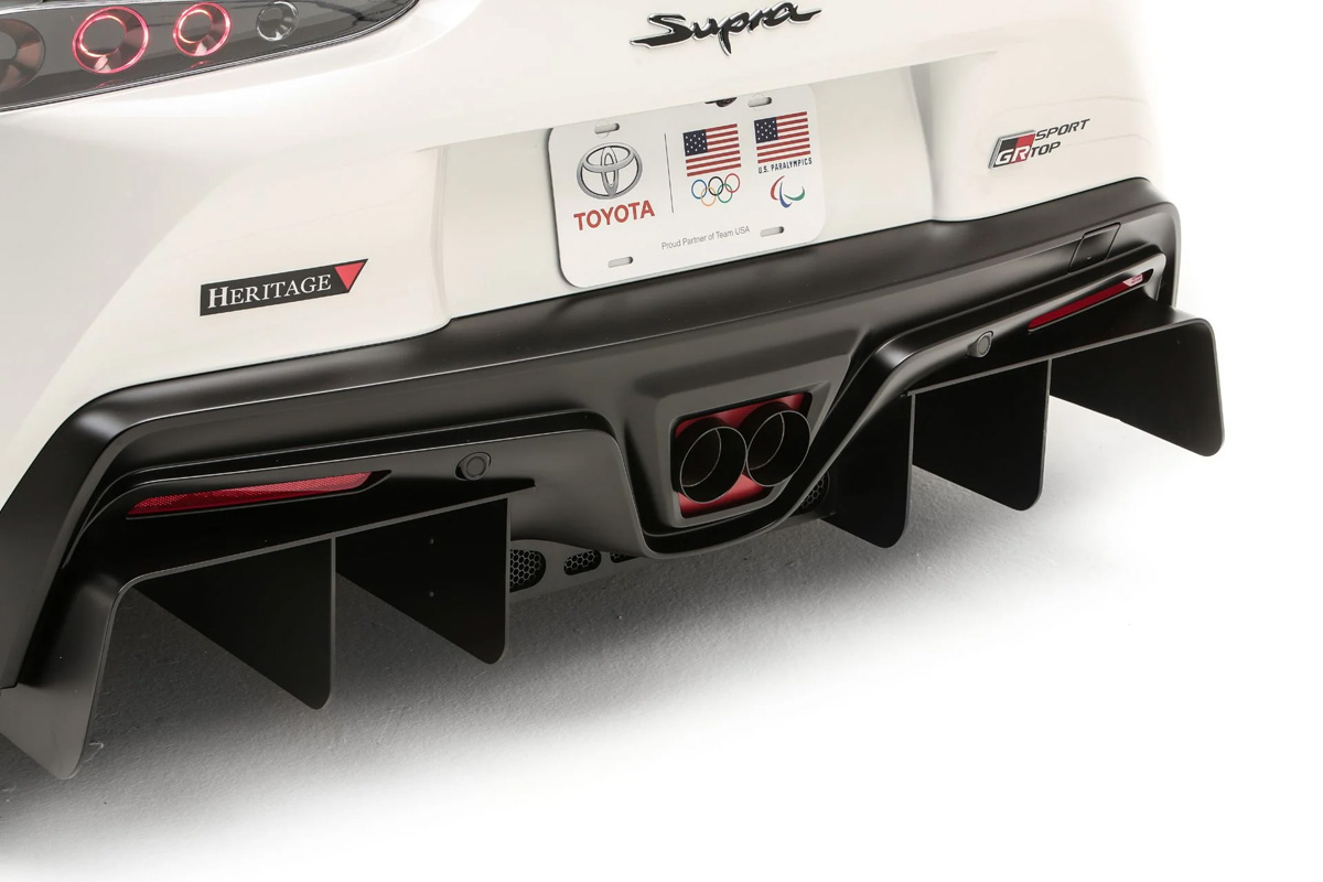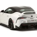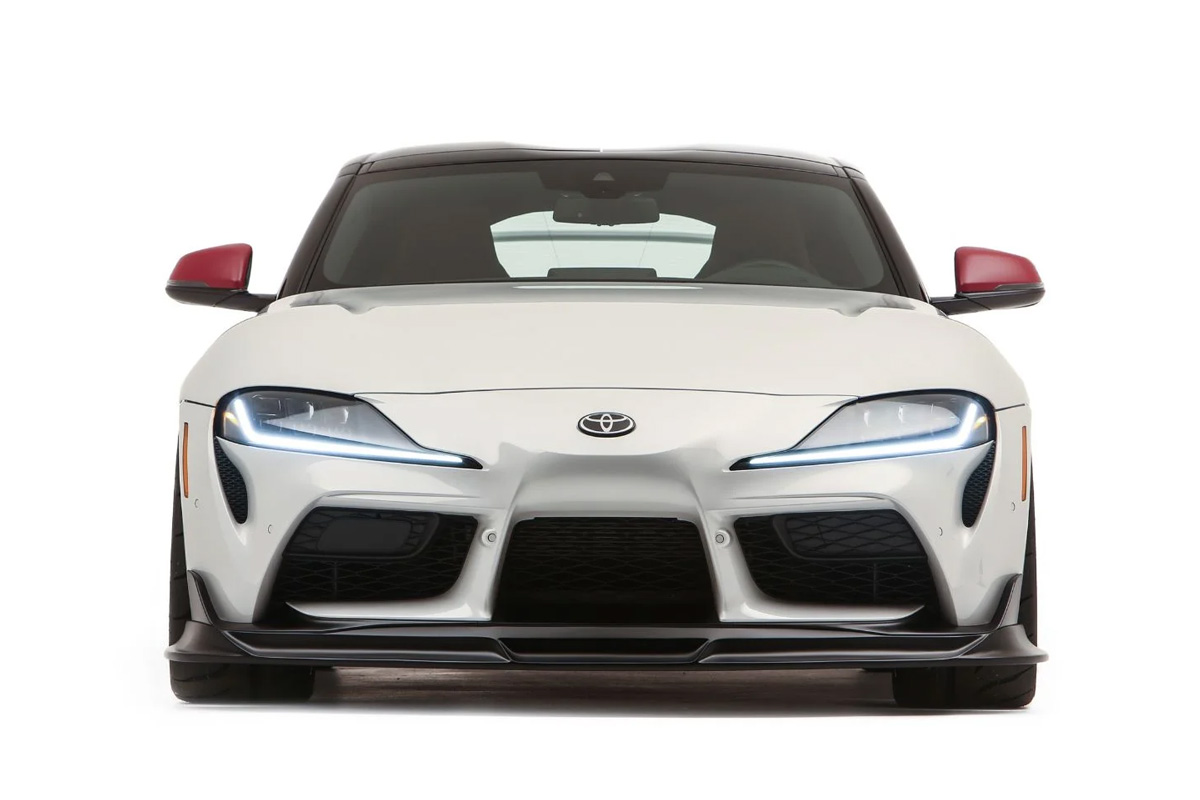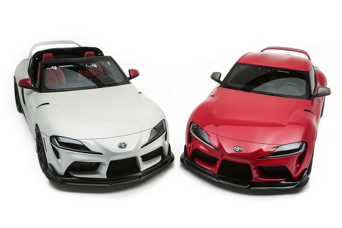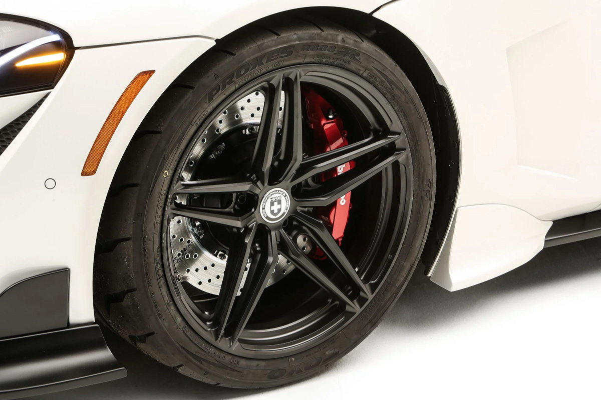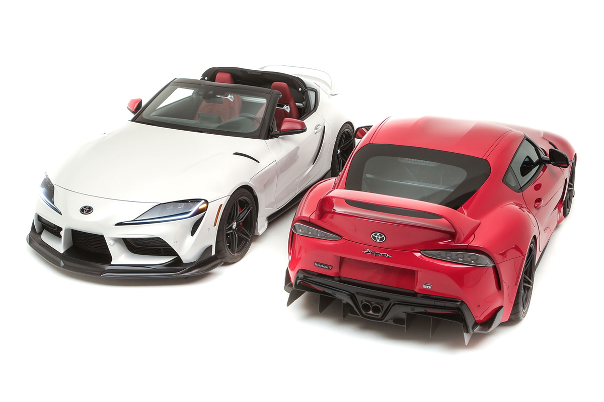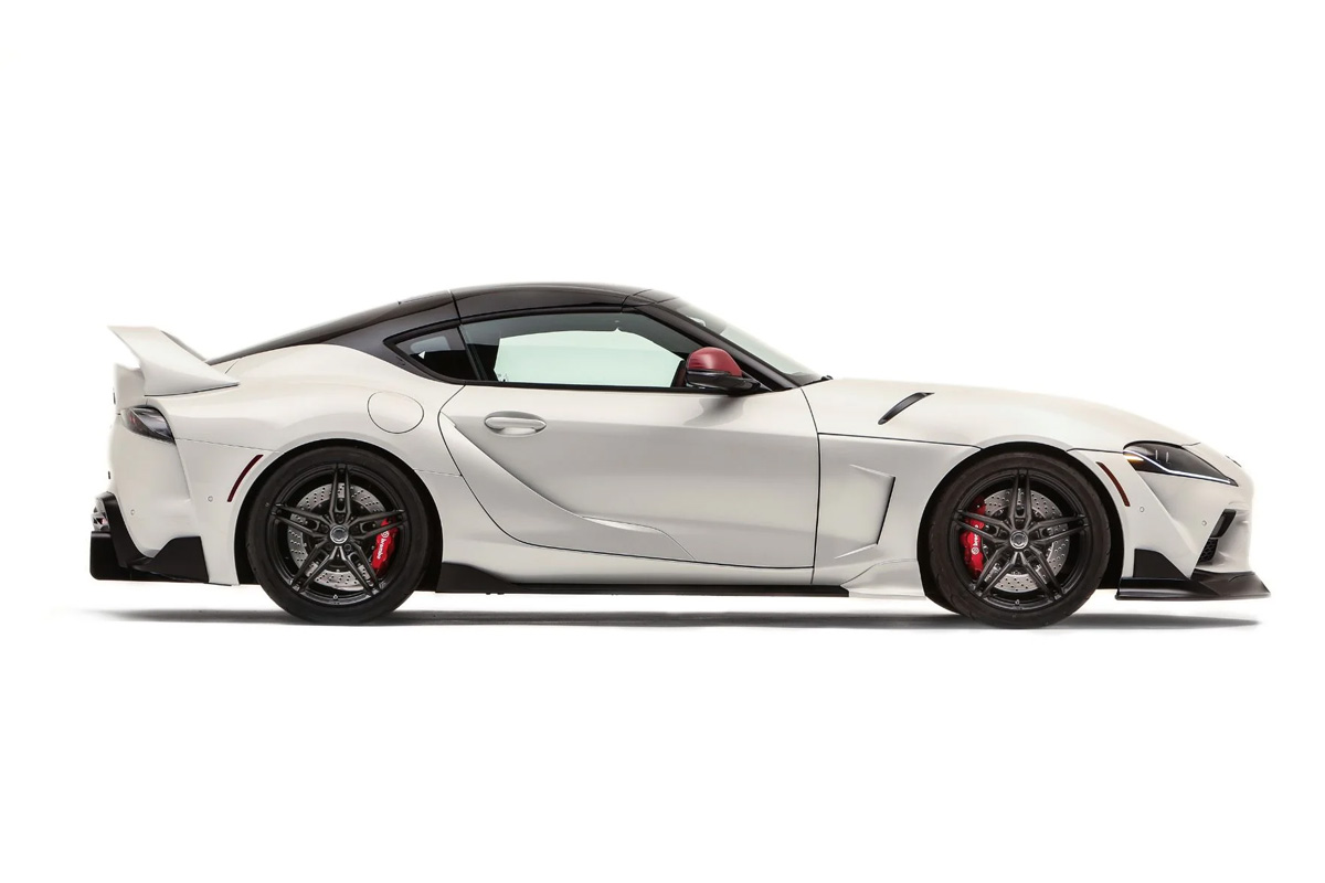 As you can see, the 2021 Supra Sport Top features retro-inspired custom headlights, taillights, an MKIV-style rear wing, a new dual-pipe center exhaust, a hand-built rear diffuser, and HRE wheels. Upgrades such as bigger brakes, tuned engine, turbocharger and ECU, and custom front and rear suspension ensure it performs as spectacularly as it looks.