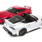 The crew ensured structural rigidity by reinforcing large sections of the car’s frame. The now iconic removeable roof includes two composite panels that can be stored in the trunk. Unlike a “T-Top” car, there is no center bar down the middle, just open air as far as the eye can see. As a sibling to the GR Supra Heritage Edition, the Supra Sport Top delivers similar styling cues like the MKIV-inspired basket handle wing and round taillights. At the same time, it’s got a striking profile all its own that includes a sexy black piano-finish canopy over the top.