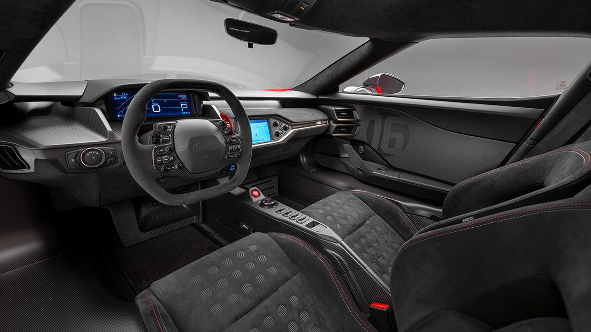 Carbon fiber carries into the cabin, appearing on door sills, console and registers. Ebony Alcantara-wrapped carbon fiber seats feature gold and red accent stitching, while embossed seating surfaces and head restraints carry the GT logo. The instrument panel is wrapped in Ebony leather and Alcantara, while pillars and headliner are wrapped in Ebony Alcantara.