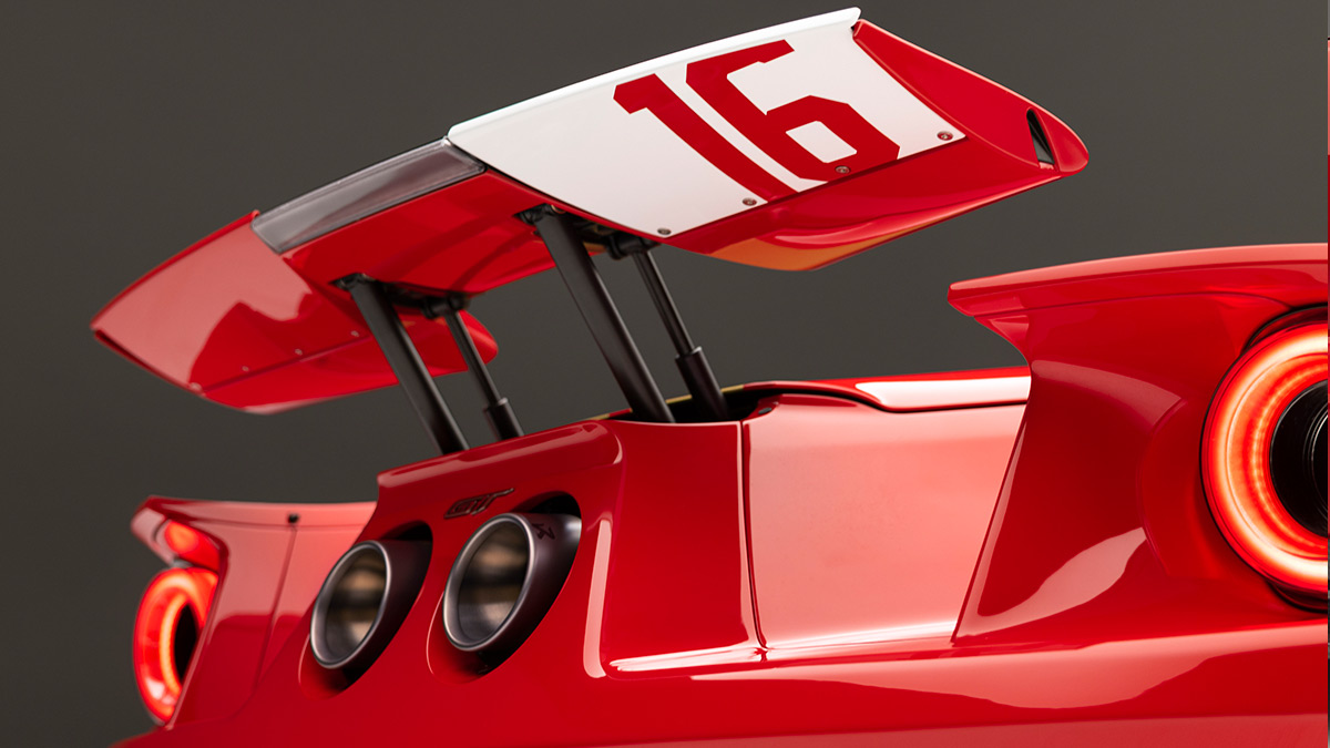 In addition to wearing unique Alan Mann red exterior paint with gold graphics, this limited-edition GT includes a dual over-the-roof racing stripe, Frozen White signature accent stripes and roundels with No. 16 on the doors, hood and underside of the rear wing.