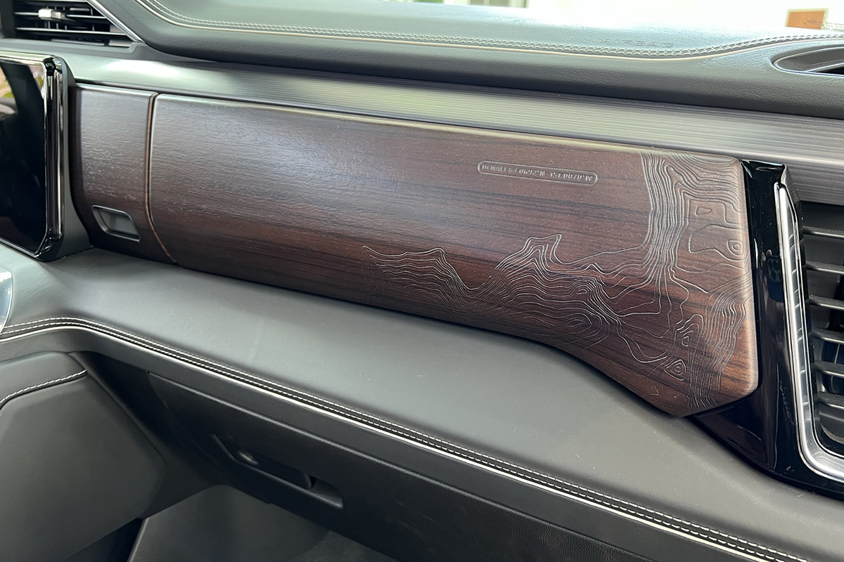 Embossed and laser-etched across the interior are a number of topographical maps of the summit of Mount Denali, the highest peak in North America. These maps can be found laser-etched on to the open-pore Paldao wood on the front passenger-side dashboard, in the full-grain leather on the front and back of the front seats, rear seat and door panels, as well as on the exterior fender vent badges. These nods to Denali are very cool details indeed.