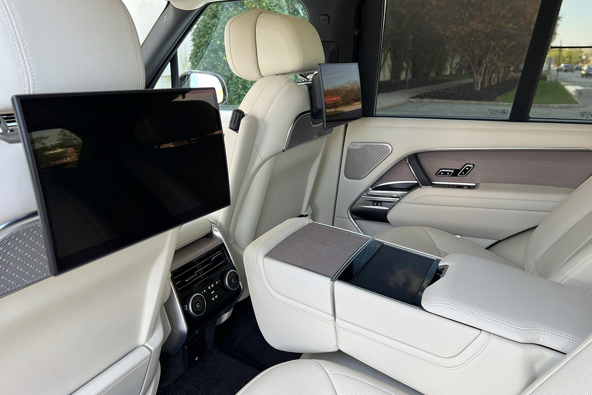 The Range Rover First Edition’s rear seats are especially noteworthy. With available power footrests, reclining seatbacks, and a whisper-quiet cabin, it’s basically like riding in a private jet on wheels. The third-generation Active Noise Cancellation system is so effective that conversations can be held in hushed tones, and the optional Meridian sound system turns the cabin into a concert hall.