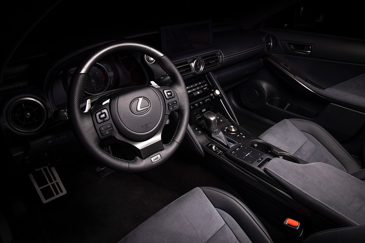 However, there are a number of other interior and exterior enhancements in the IS 500 Launch Edition. Inside, sporty two-tone black & gray Ultrasuede material trims front and rear seats, door accents, and the center console. The heated leather-wrapped steering wheel sports silver ash wood treatment with black F SPORT Performance badging, and there’s a serialized Launch Edition badge commemorating each car as one of 500. Lastly, when you fire up the car, there’s an exclusive Launch Edition startup animation compared to other IS 500 models.