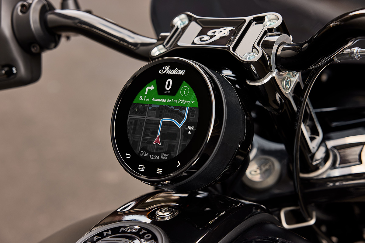 Ride-enhancing technology comes standard with Indian Motorcycle’s class-leading four-inch touchscreen powered by RIDE COMMAND. Accessible via handlebar controls or the digital touchscreen display, riders can cycle through multiple interfaces, including two different gauge configurations, bike and ride information, and turn-by-turn navigation with connected features like weather and traffic overlays. If using a wireless helmet communicator, riders can control their music within the RIDE COMMAND system once their phone is paired via Bluetooth or USB. Riders can also access phone information, including recent calls, contacts, number pad and text message history. When connected, incoming calls will appear and can be accepted or declined directly through the RIDE COMMAND system.