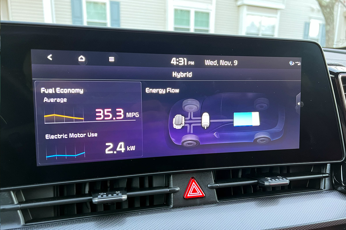 The hybrid system shines in everyday driving. Around town, it uses electric power frequently, and on the highway, the gas engine hums along quietly and efficiently. Over my week with the Sportage, I averaged 38 MPG in mixed driving, which is impressive for an all-wheel-drive SUV of this size, especially with my heavy foot.