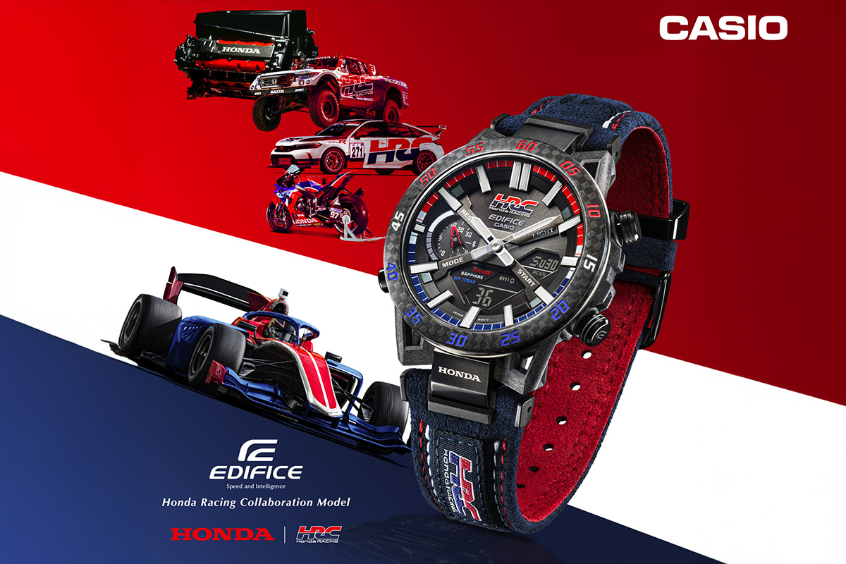 The Casio EDIFICE ECB2000HR-1A is a limited-edition timepiece developed in conjuction with Honda Racing Collaboration (HRC), and it’s a must-have for motorsport enthusiasts and Honda fans alike, blending precision engineering with striking design. Inspired by Honda’s high-performance racing heritage, this timepiece features a distinctive tricolor design that symbolizes HRC’s racing spirit: red for “Passion for victory,” blue for “Advanced technology,” and white for “For all motorsports fans.” These elements are integrated throughout, including the carbon bezel’s numeric markings, dial ring minute indicators, and LCD feature indications.