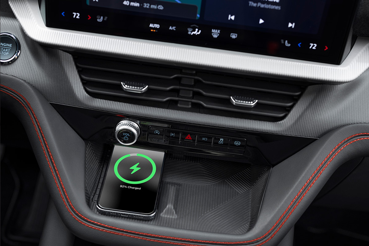 The dashboard has been pushed forward to give front-row passengers a more open and spacious cabin. An integrated tray below the touchscreen houses an available wireless phone charging pad and there are USB connections to charge mobile devices in all three rows.