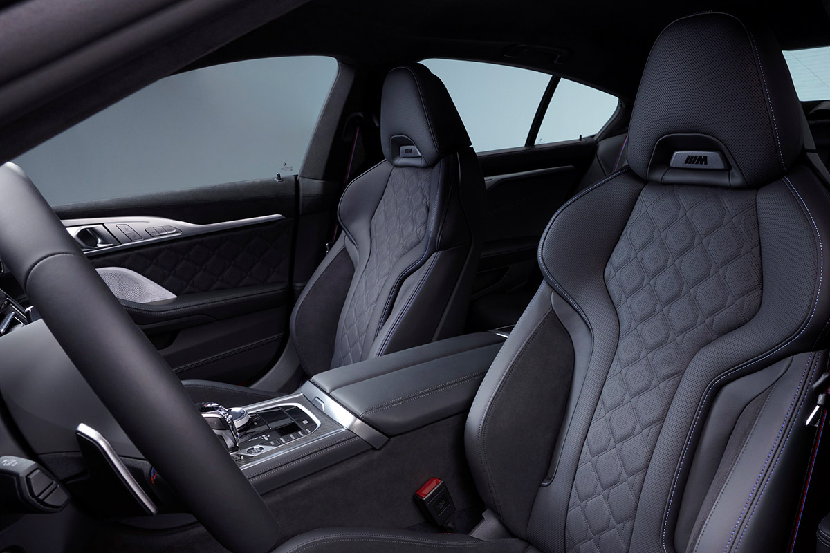 Inside, the M850i Edition M Heritage features M Sport seats finished in BMW Individual Black Full Merino Leather and Alcantara, complete with a diamond-shaped upholstery pattern. Alcantara extends to the headliner, dashboard, and upper door panels.