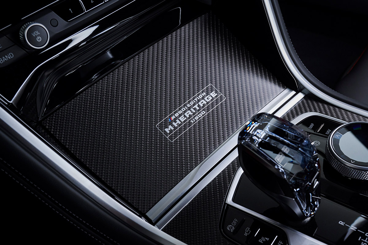 M tri-color stitching adds a subtle performance touch, while non-illuminated M badges in the headrests emphasize exclusivity. Unique elements include a matte-finish carbon fiber center console, glass shift lever, and “M850i Edition M Heritage” and “1/500” inscriptions on the cupholder cover and doorsills.