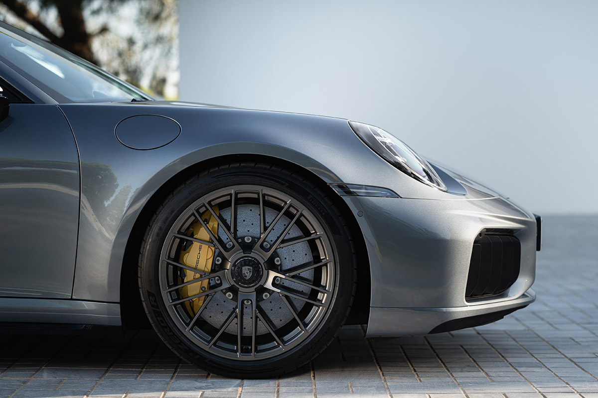The 911 Turbo S comes standard with an electro-hydraulically controlled Porsche Dynamic Chassis Control (ehPDCC) system, which dramatically reduces body roll and sharpens agility through corners. Using the 400-volt electrical system and high-voltage battery, it reacts faster than the previous hydraulic setup, while cross-connected active coupling rods adjust pressure on the fly for a perfect balance of comfort and performance. For everyday usability, an optional front axle lift can raise the nose faster than older systems, making speed bumps and driveways a non-issue. As with past Turbo models, the front and rear tracks are wider than the Carrera models, boosting stability and cornering confidence.
