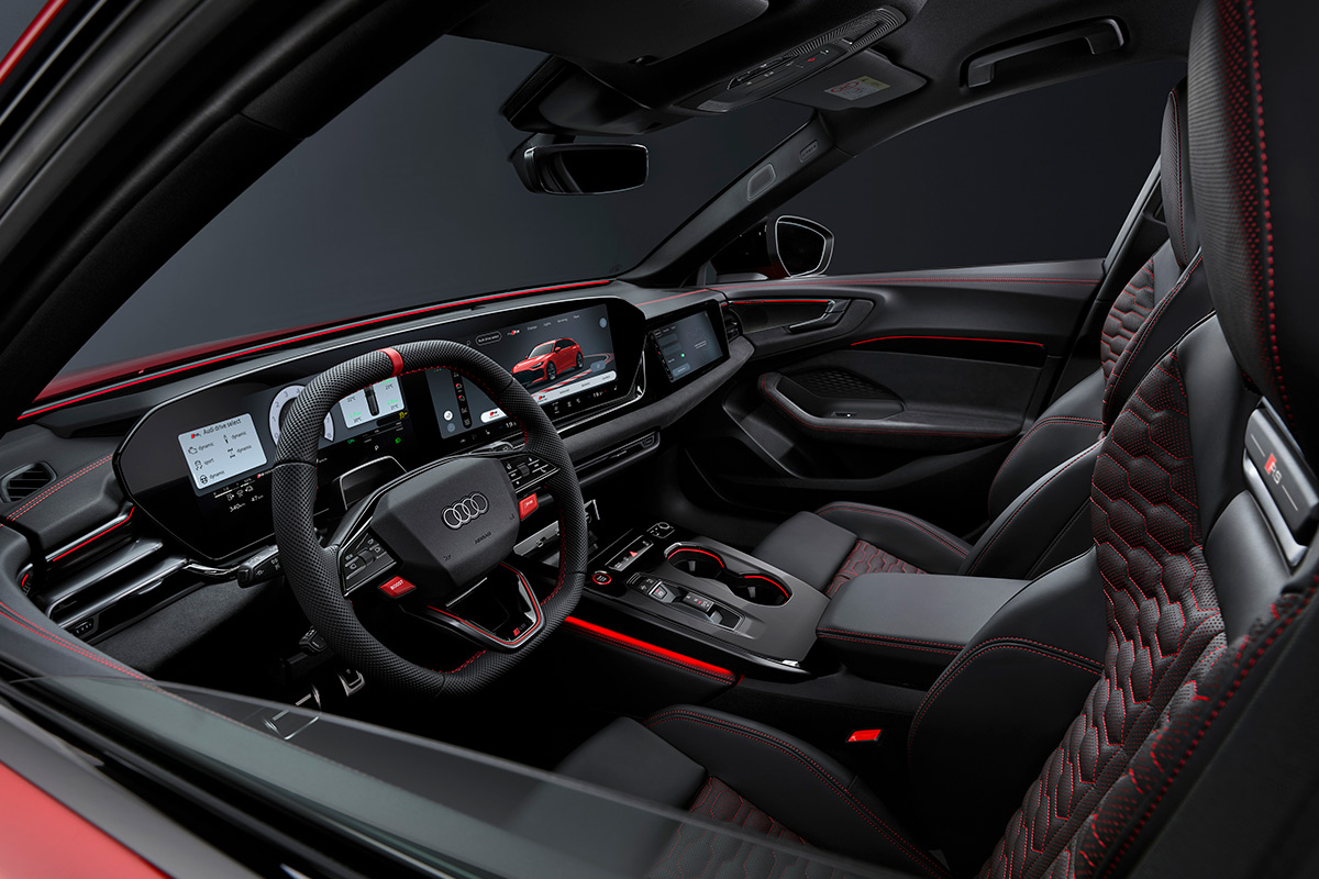 The cockpit is built around a curved panoramic OLED display setup combining an 11.9-inch virtual cockpit and a 14.5-inch MMI touchscreen. A 10.9-inch passenger display is standard. The head-up display can project a rev counter onto the windshield and even guide you through launch control.