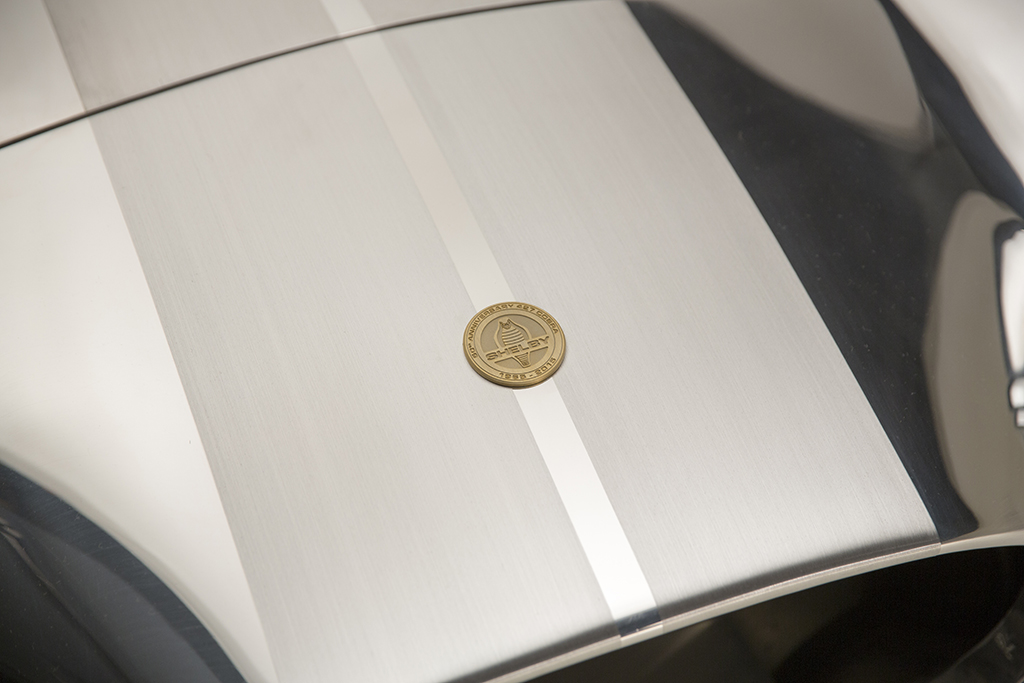 The cars will all come with special gold 50th anniversary badging, logos and features, and will be offered with either aluminum (from $119,995) or fiberglass (from $179,995) bodies. The aluminum cars will be offered in Polished Aluminum (with or without brushed stripes) or Guardsman Blue with Wimbledon White Stripes. The fiberglass bodied cars will only be offered in Guardsman Blue with Wimbledon White Stripes.