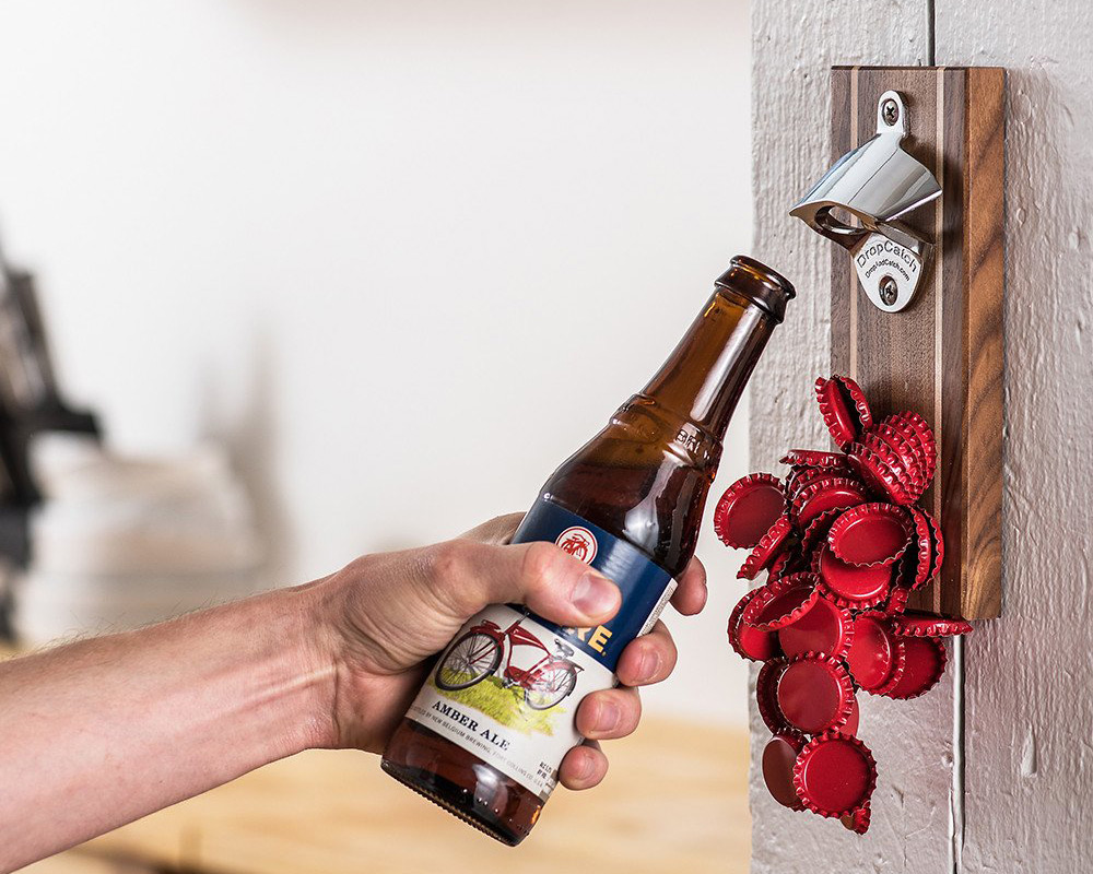 The Drop Catch is a smart way to keep from finding bottle caps all over your place after a party. Just mount it on your wall and when you use it to pop open a bottle the embedded magnet catches it. Not only will it catch the one you just popped off, but it will catch and hold over 50 more. Available in either “Wheat” or “Porter,” the Drop Catch is the perfect addition to any kitchen or home bar area