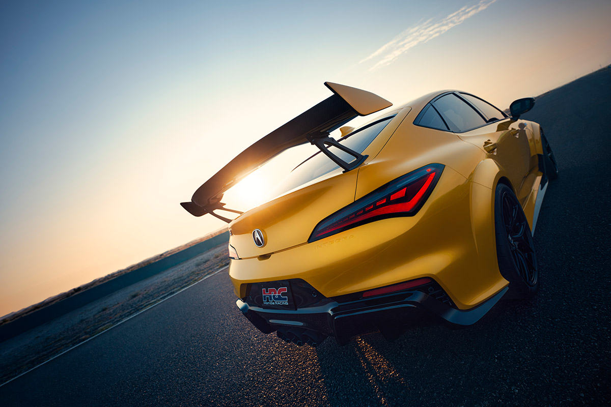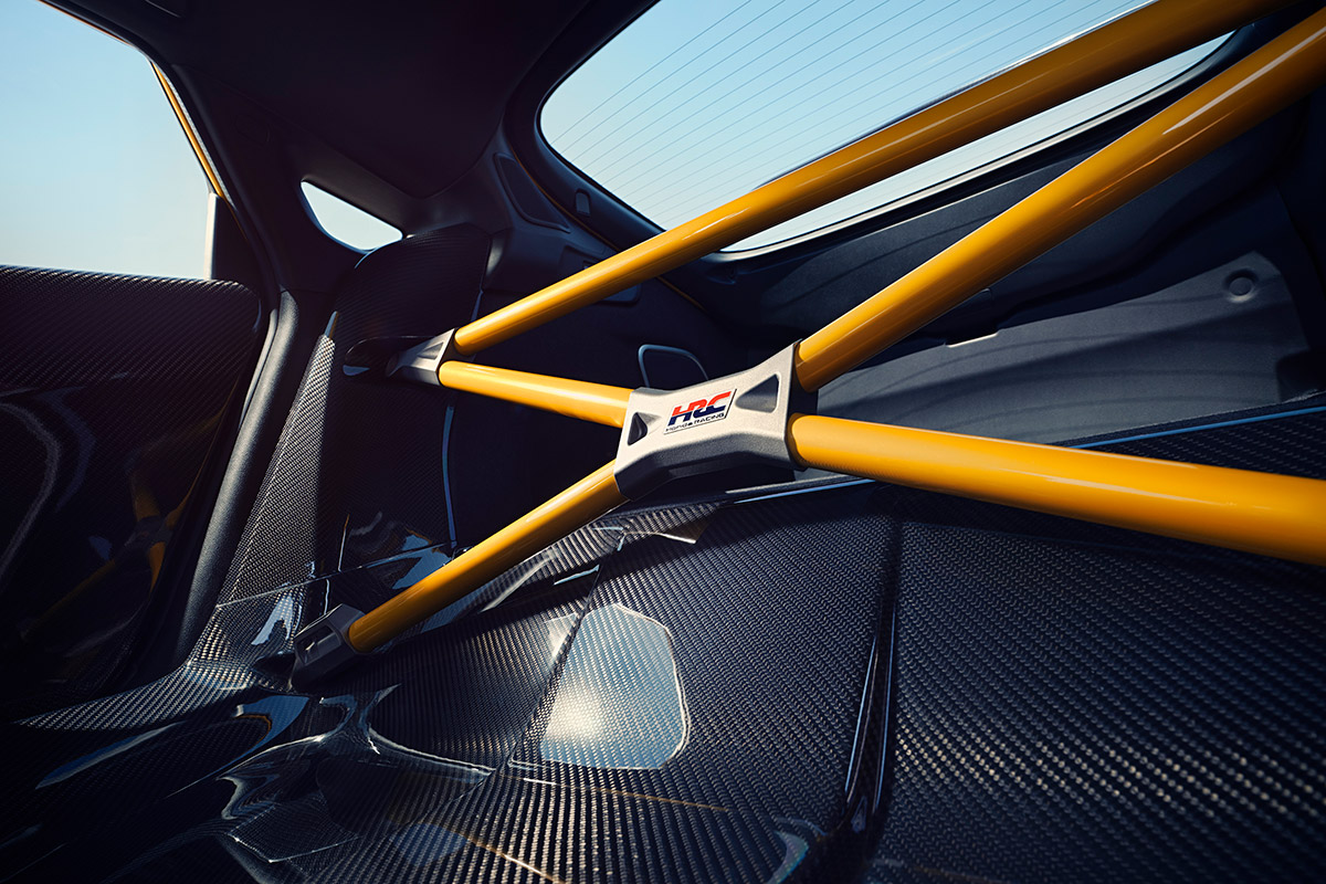 The Prototype’s visually intense bodywork is finished in striking Indy Yellow Pearl paint, a color that debuted on the second-generation NSX supercar. Custom milled aluminum HRC badges on the grille, front fenders and decklid make a bold statement, featuring the same logo seen on winning Honda and Acura race machines in IndyCar, IMSA and Formula 1.
