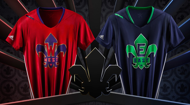 Designed by adidas, the 2014 NBA All-Star uniforms were inspired by New Orleans’ rich and unique culture and feature vibrant Mardi Gras colors and shiny brass and silver accents on a short-sleeved silhouette. The NBA All-Star logo appears on the chest of the blue “East” and red “West” jerseys in the shape of the fleur-de-lis, with a purple “W” or green “E” cut out to identify the conference of each player.