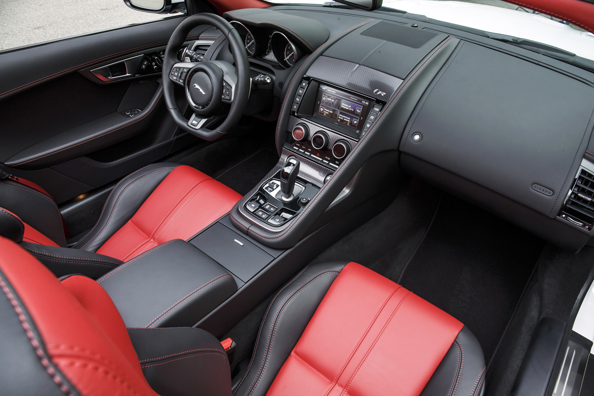 The interior of the Jaguar F-TYPE R continues this, offering a distinct mixture of British old world design and modern convenience. A grab-handle shifter replaces the usual pop-up rotary dial found in most Jag models, but that signature “Good day, Mr. Bond” appeal is held with the rising vents upon engine start. The sport steering wheel is sized for a solid grip and instruments are positioned for an easy glance during the drive. Infotainment dominates the center stack, but there are enough dials and buttons surrounding it to take the bleeding edge off and keep the old school aircraft appeal of a sports car.