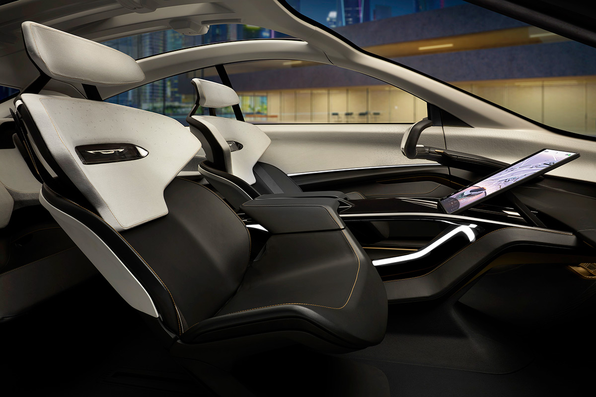 The sculpted cockpit is centered by a cross-car pillar-to-pillar transparent display, providing a forward-looking view of information while keeping eyes on the road. Complementing the display is a stowable 15.6-inch console screen that can be rotated for either portrait or landscape orientation and can assist in start-up and quick access to information. The displays can be fully controlled by voice recognition commands, diminishing the need for driver input.