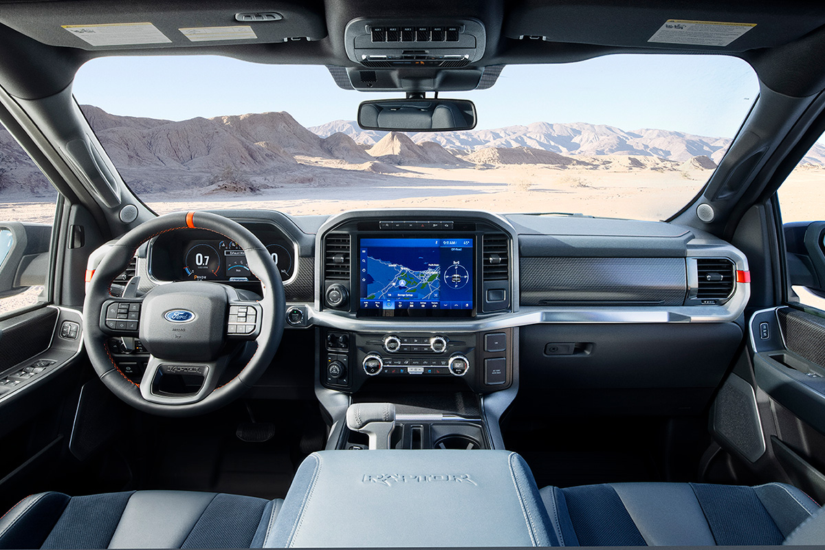 The all-new F-150 Raptor debuts a high-tech cockpit built for a commanding view in comfort and style. A new standard and customizable 12-inch digital gauge cluster features a large information-on-demand area with Raptor-specific graphics and animations, off-road data and turn-by-turn navigation. A customizable new 12-inch center screen is standard, allowing owners to split the screen and control multiple functions simultaneously, including music, navigation or truck features.