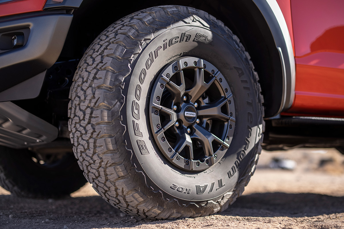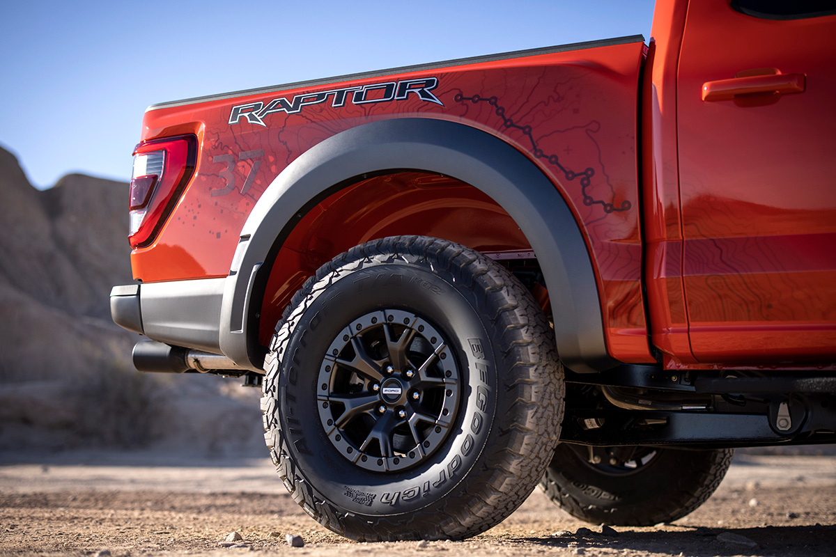 For the first time, Raptor is available with either 35-inch or 37-inch tires – the largest factory-fitted to a production light-duty full-size pickup. These specially designed BFGoodrich All-Terrain T/A KO2 tires offer maximum traction and handling. With 35-inch tires, Raptor clears 12-inch obstacles with an approach angle of 31°, maximum departure angle of 23.9° and a breakover angle of 22.7°. Outfitted with 37-inch tires, the 2021 Raptor features 13.1 inches of running clearance, 33.1° of approach angle, a maximum 24.9° of departure angle and 24.4° of breakover angle. Desert runners and rock crawlers alike will appreciate the outstanding wheel travel with 35-inch tires, reaching 14 inches at the front and 15 inches at the rear – 25% more travel than the first-generation Raptor.