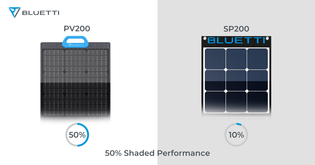 Shade is your enemy when it comes to solar power. Partial shading of the system also matters as all panels in a section need to run at the same voltage; if one panel is shaded even partially, this will bring down the production of the whole system. We’ve also encountered this issue with BLUETTI’s SP200 panels, 10% of area shading may cause a shockingly 40% or more power loss to the whole solar array, The same thing can happen with panels from other brands.