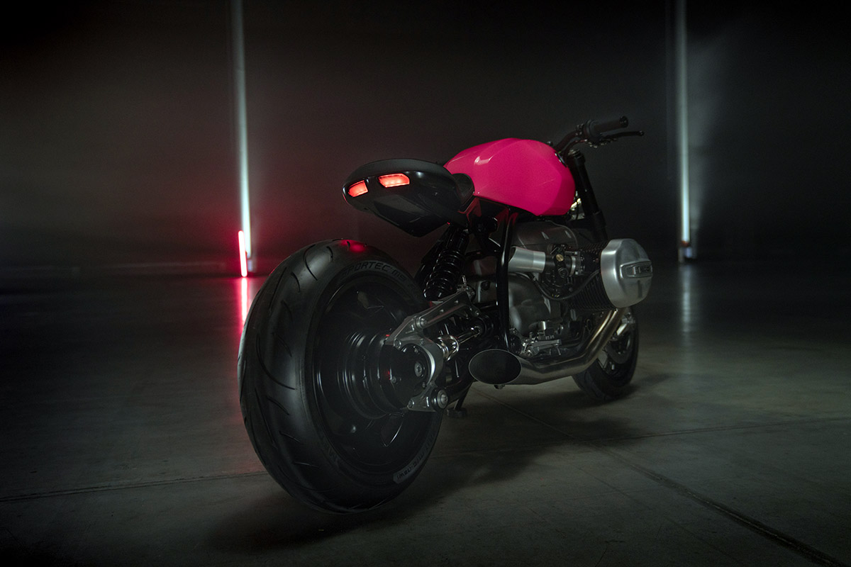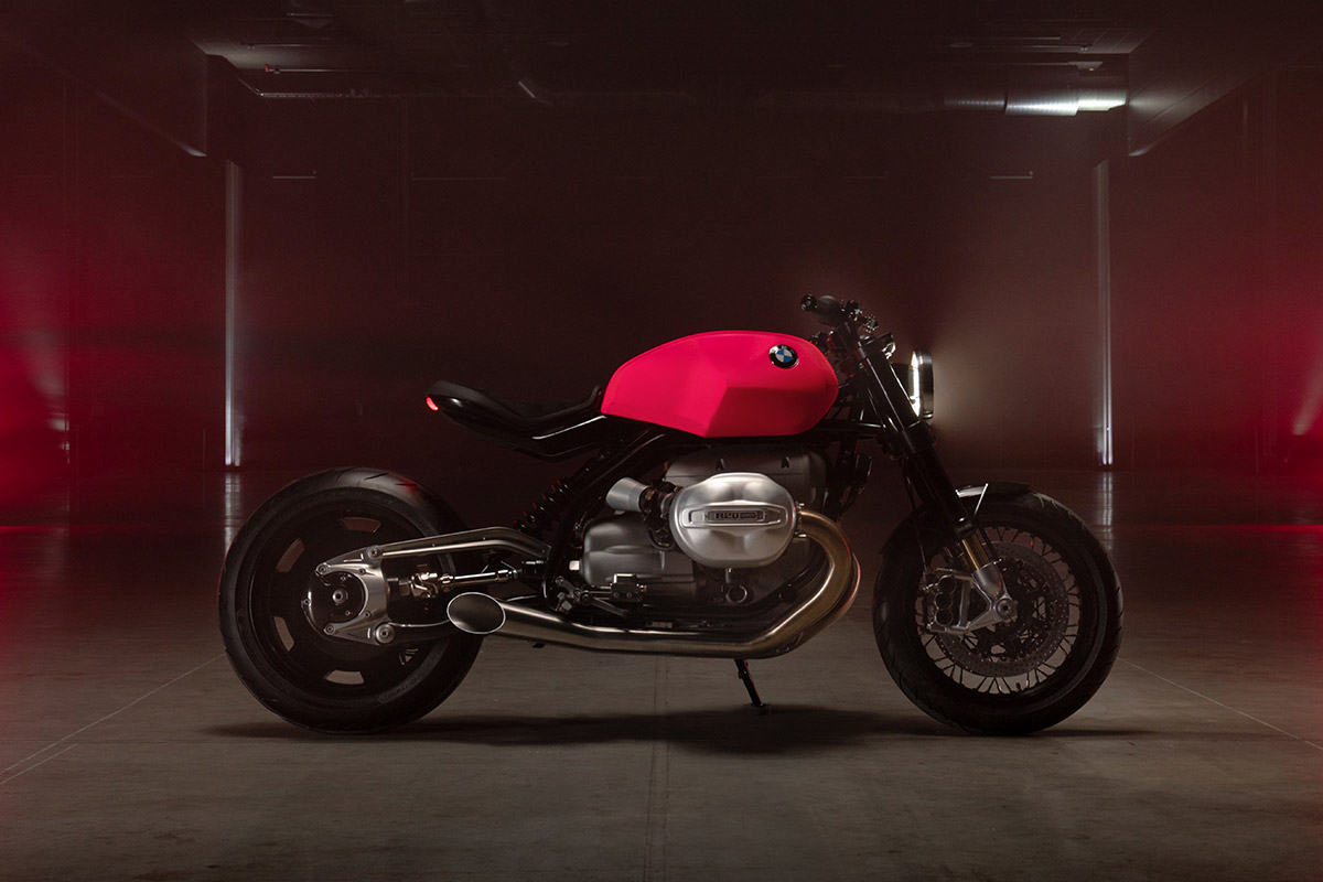 The aluminum tank got a new design and presents itself in the progressive color “hotter than pink” from the 1970´s. The BMW R20 concept is color-coordinated with the cylinder head covers, belt cover and air intake funnels made of polished and anodized aluminum, as well as the Paralever strut, footrest system and the ISR brake calipers in gunmetal.