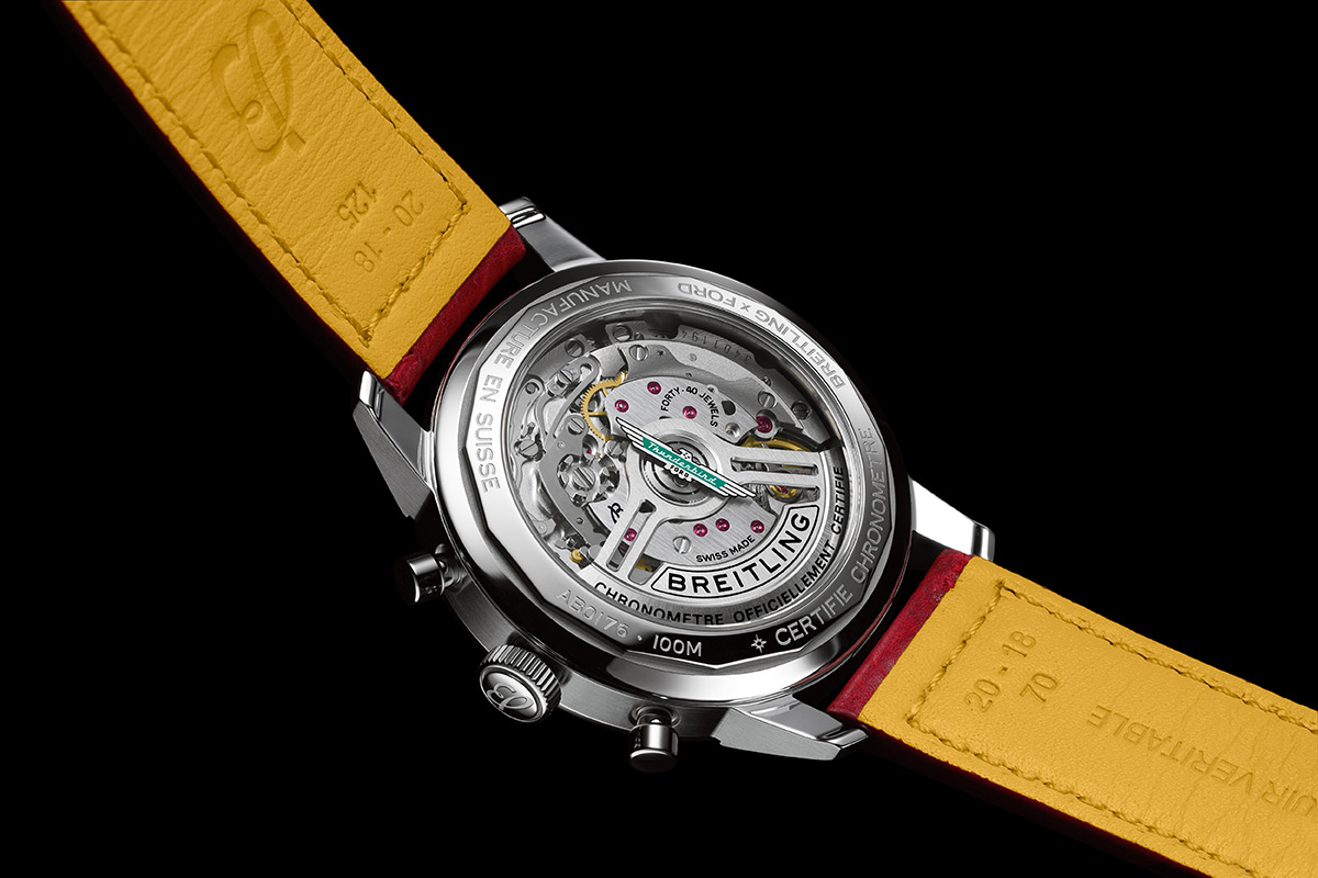This exceptional manufacture movement, whose refined mechanics are visible through the open sapphire-crystal caseback, provides a 70-hour power reserve (approx.) and a five-year warranty. First released in 2009, the Breitling 01 Caliber is one of the most highly regarded chronograph movements in the industry, designed for maximum precision, reliability, and functionality. As with all of Breitling’s mechanical calibers, each one has achieved the rigorous COSC certification. And as a manufacture movement, it must also pass a grueling series of in-house shock, winding, and pusher tests. To house the caliber, the Top Time case has been enhanced and provides an increased water resistance of 100m (10 bar).