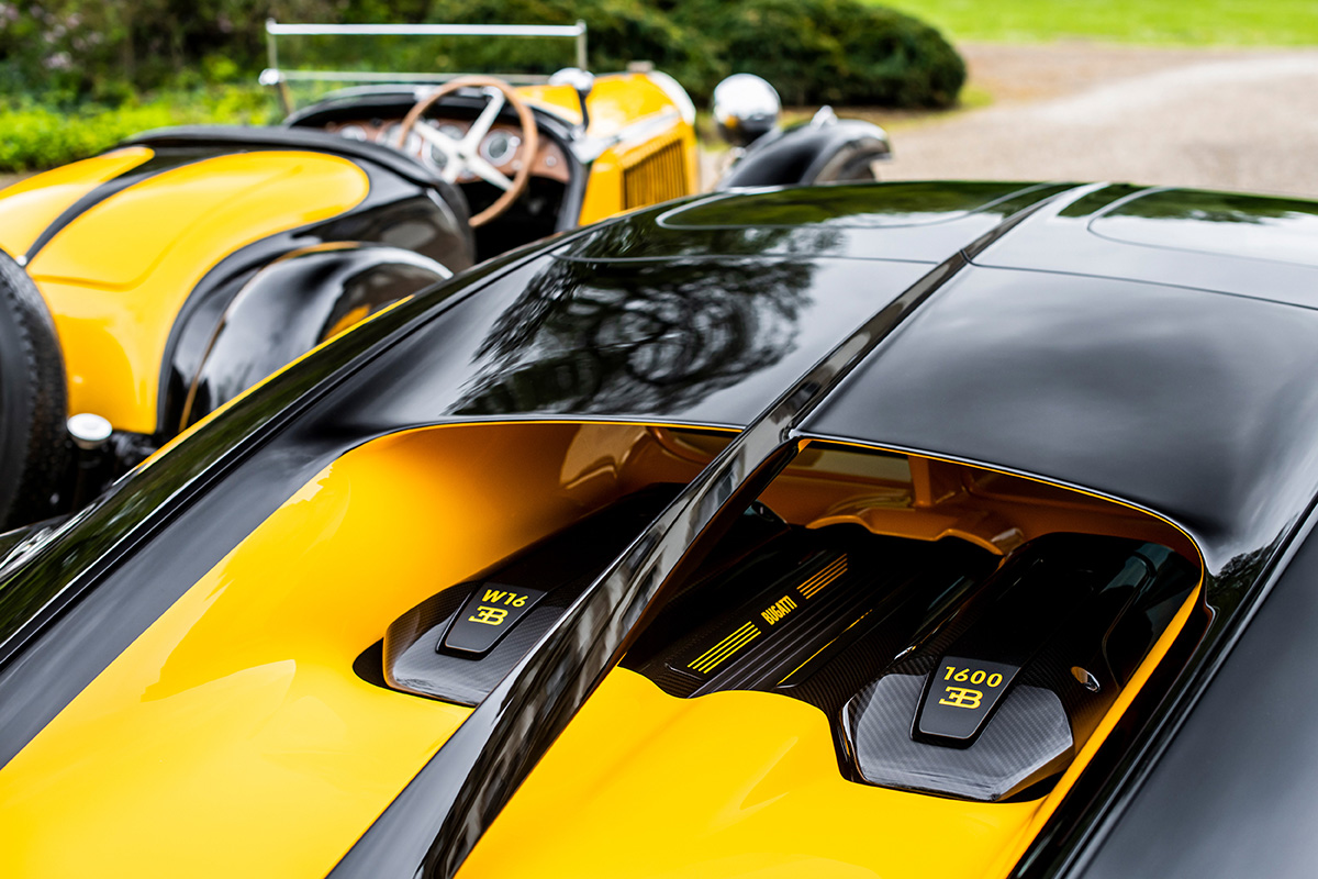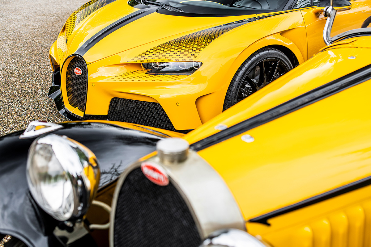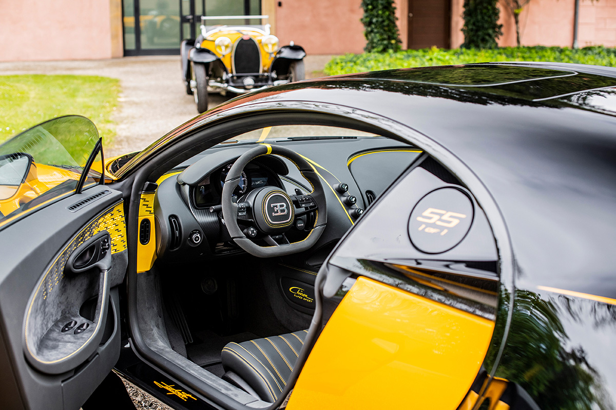 In capturing the essence of the historic car, the Sur Mesure team focused on the now famous duotone paint scheme introduced by Jean with the Type 55, utilizing the black and yellow combination so favored by Ettore Bugatti. On the Chiron Super Sport, the colors not only serve to portray dynamism but also as a means to visually break up the expansive surfaces of the hyper sports car.