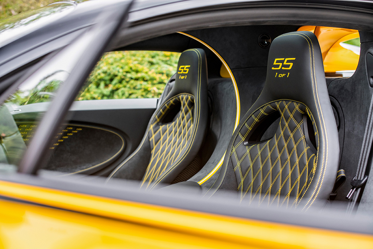 Jean’s meticulous attention to detail extended beyond the exterior, influencing the interior aesthetic as well. As such, the references to the Type 55 Super Sport reach into the inside of the ’55 1 of 1′. Featuring sleek black leather that further accentuates the exterior aesthetic, the cabin includes unique accents such as embroidered headrests displaying a unique ’55 1 of 1′ inscription. The fading ’55’ motif also continues, this time skillfully hand-stitched into the door panels in a vibrant yellow color.