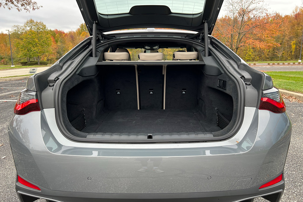 As a daily driver, the i4 works well. As you can see in the pics below, the hatchback design offers solid cargo space, rear seat room is decent for adults, and the quiet cabin makes commuting stress-free. Driver-assist tech is plentiful and generally smooth in operation.