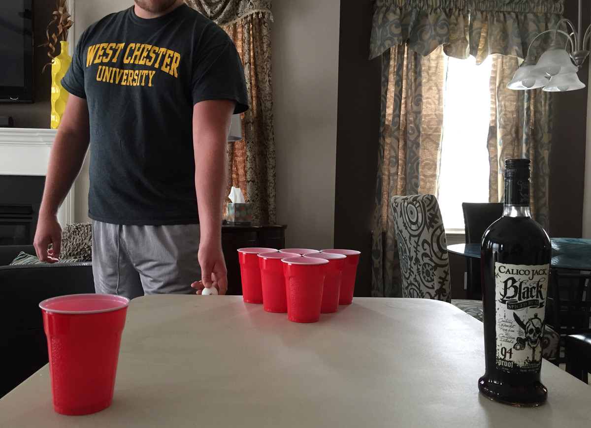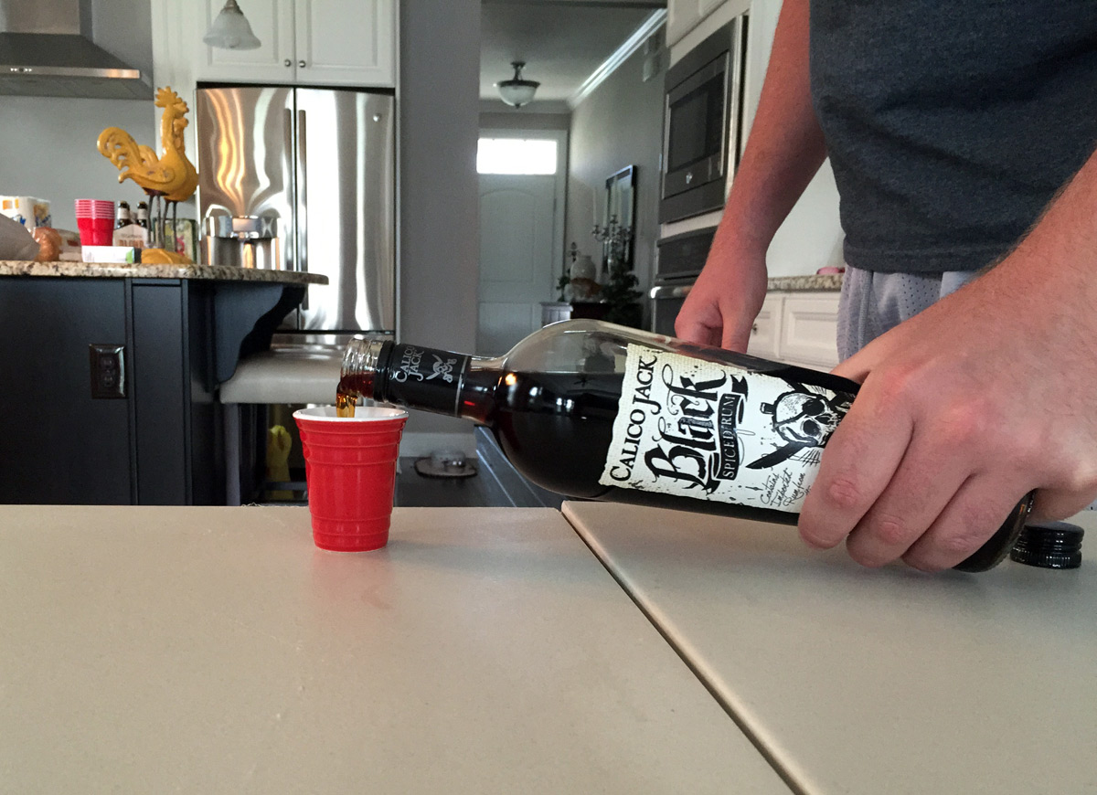 Luckily, we had a few bottles of Black Spiced Calico Jack Rum® on hand, so we improvised and turned it into a game of shot pong instead. For those of you who haven’t played shot pong before, you set up the cups like normal beer pong, only instead of beer, you’ve got 3 cups containing a shot of alcohol, and 3 cups with water. Players take turn shooting ping pong balls at the cups, hoping for the cups with alcohol.