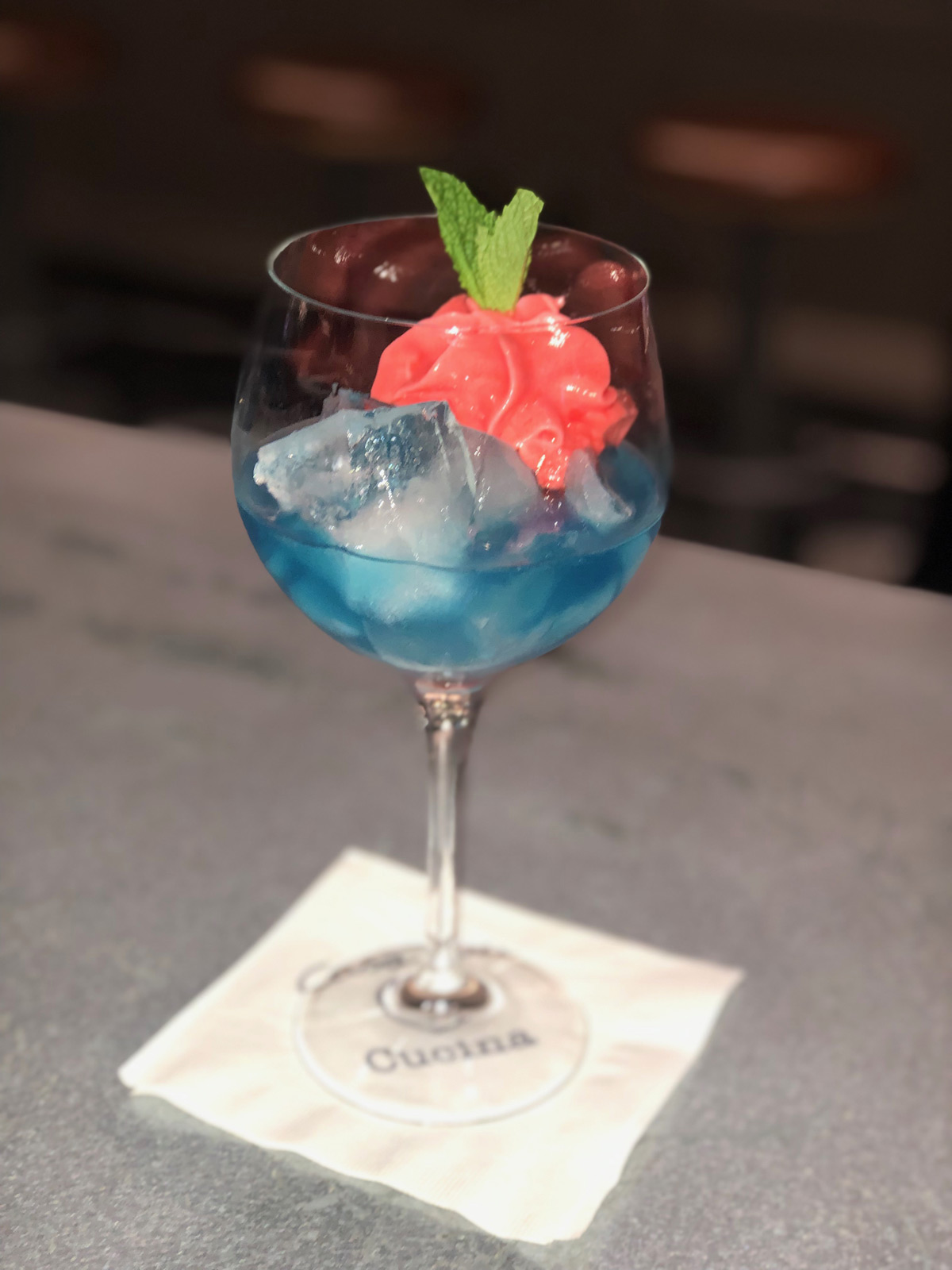 Blue base: Infuse the gin with dock anchan flower and dry lavender, add 1 oz of fresh lime juice and 1 oz of simple syrup, shake vigorously and poor on wine glass over ice.