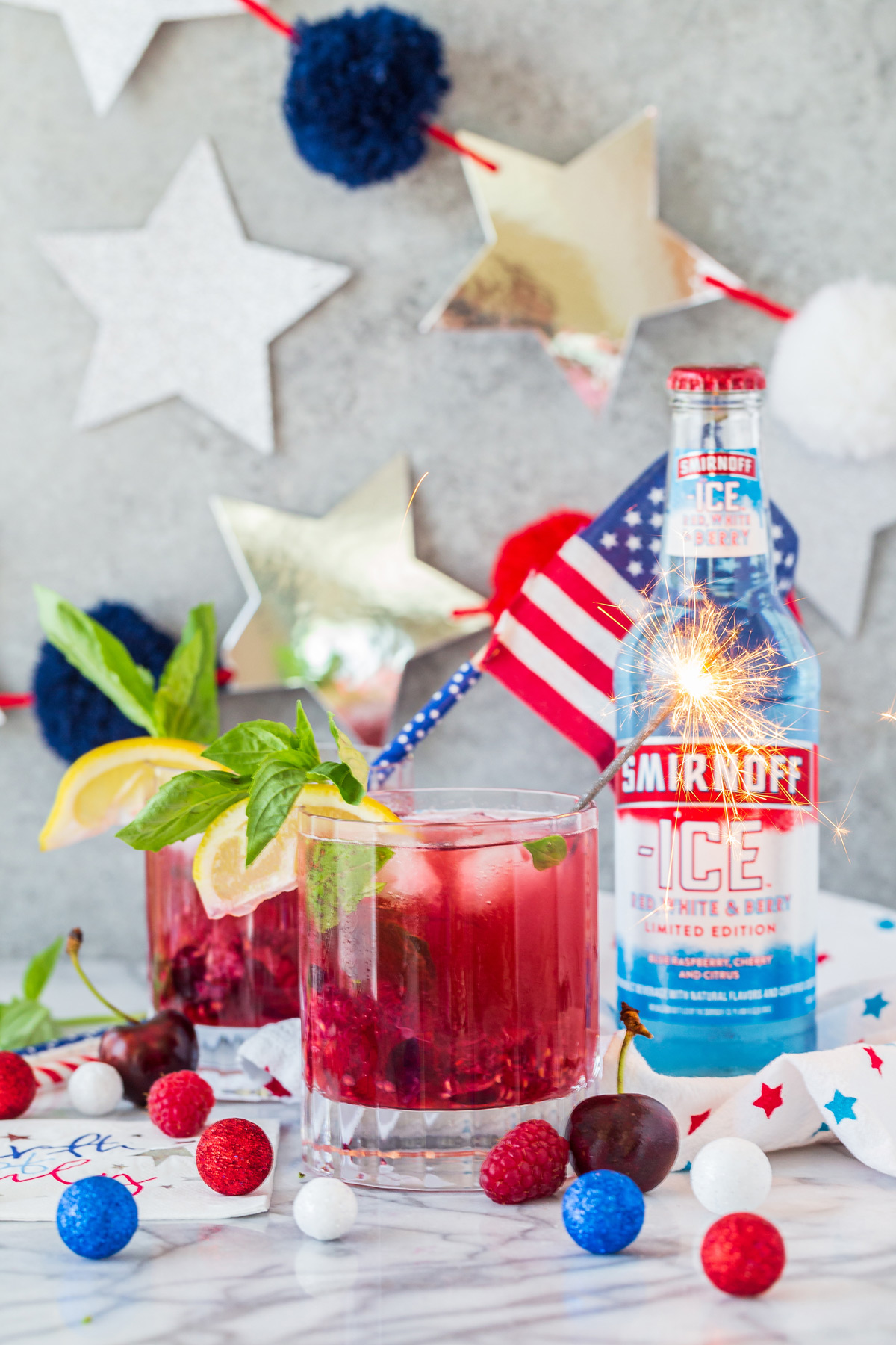 Combine cherries, raspberries and basil into the bottom of a cocktail shaker and smash. Add Juice, Smirnoff No. 21 Vodka and ice. Shake vigorously and strain into a glass and pour in Smirnoff Ice Red, White & Berry. Garnish with lemon, cherries, raspberries and sprig of basil.