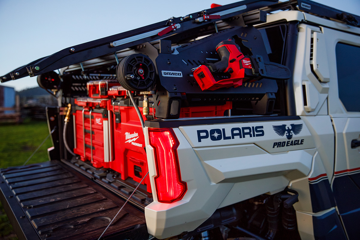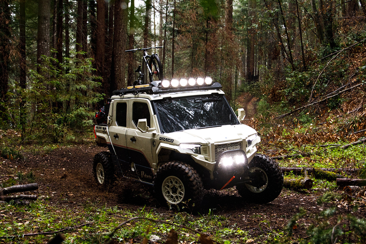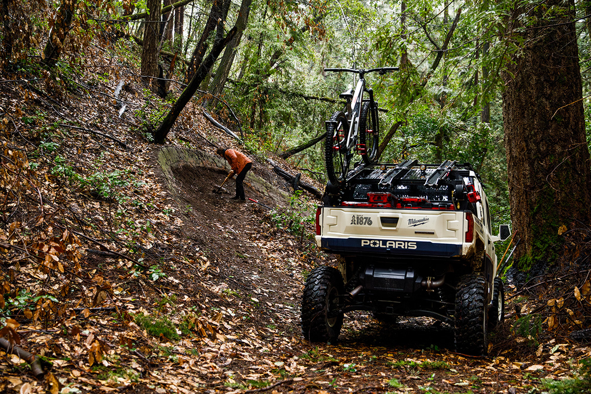 As you can see, DRACO UTV went all out – outfitting the vehicle with features like a roof rack optimized for trail-building tools, triple bike racks for secure storage over the rear bed, a 7-gallon onboard water tank, available onboard air to inflate tires, and more.