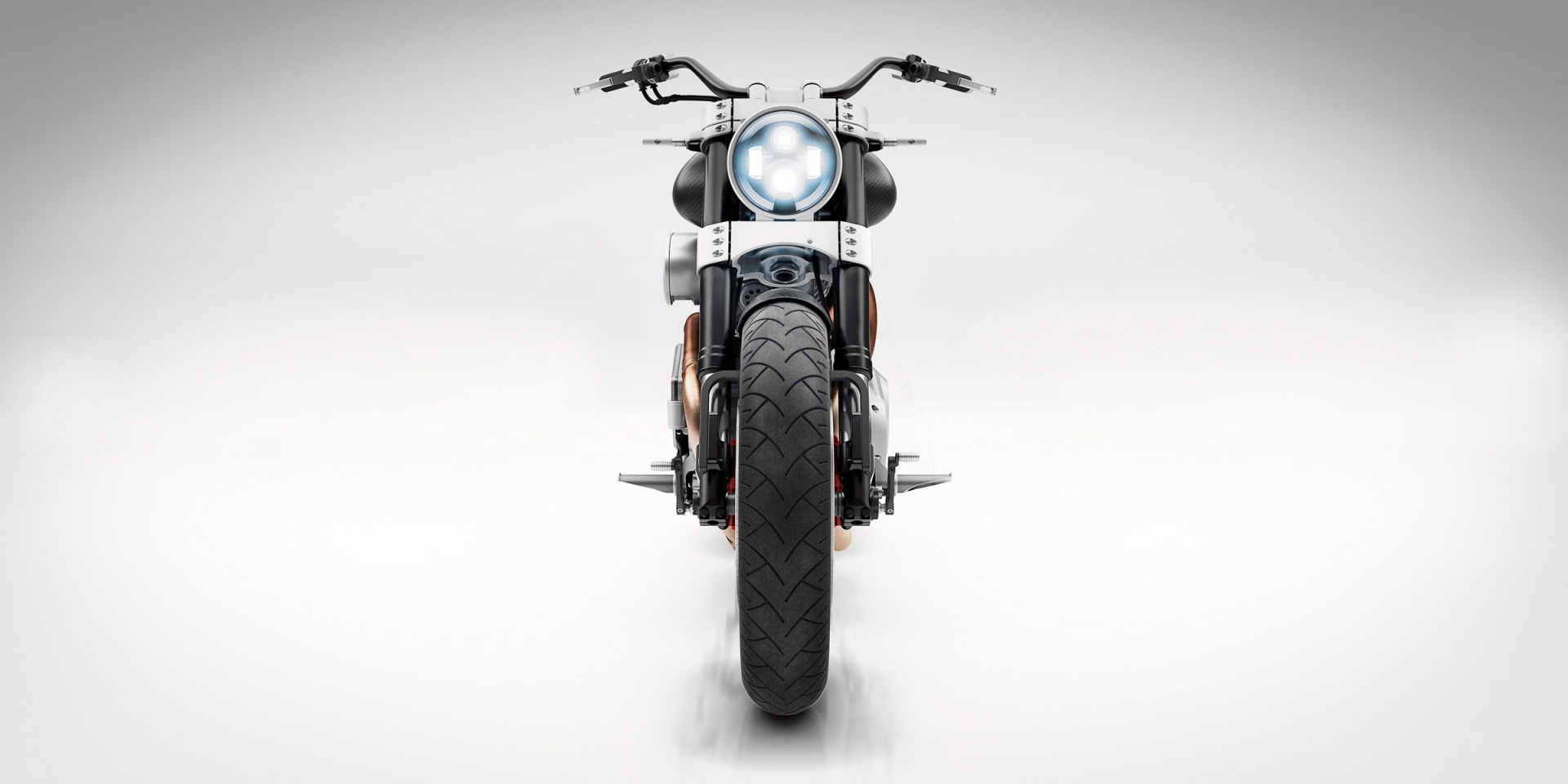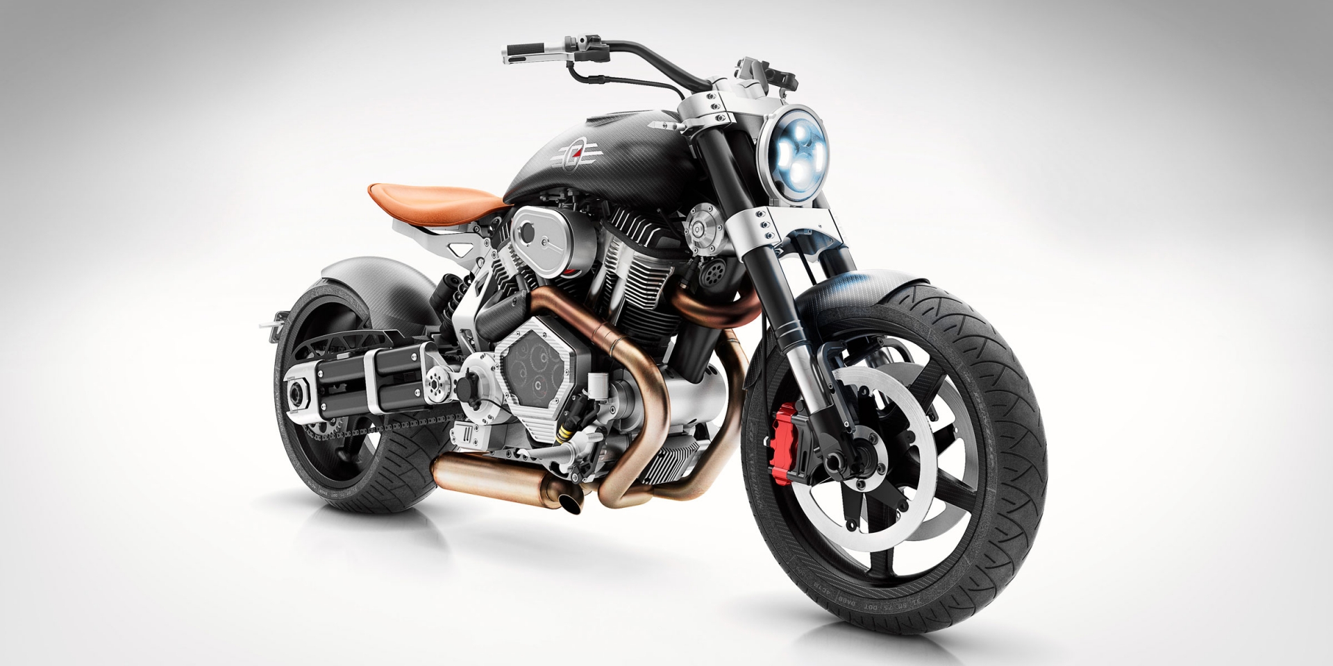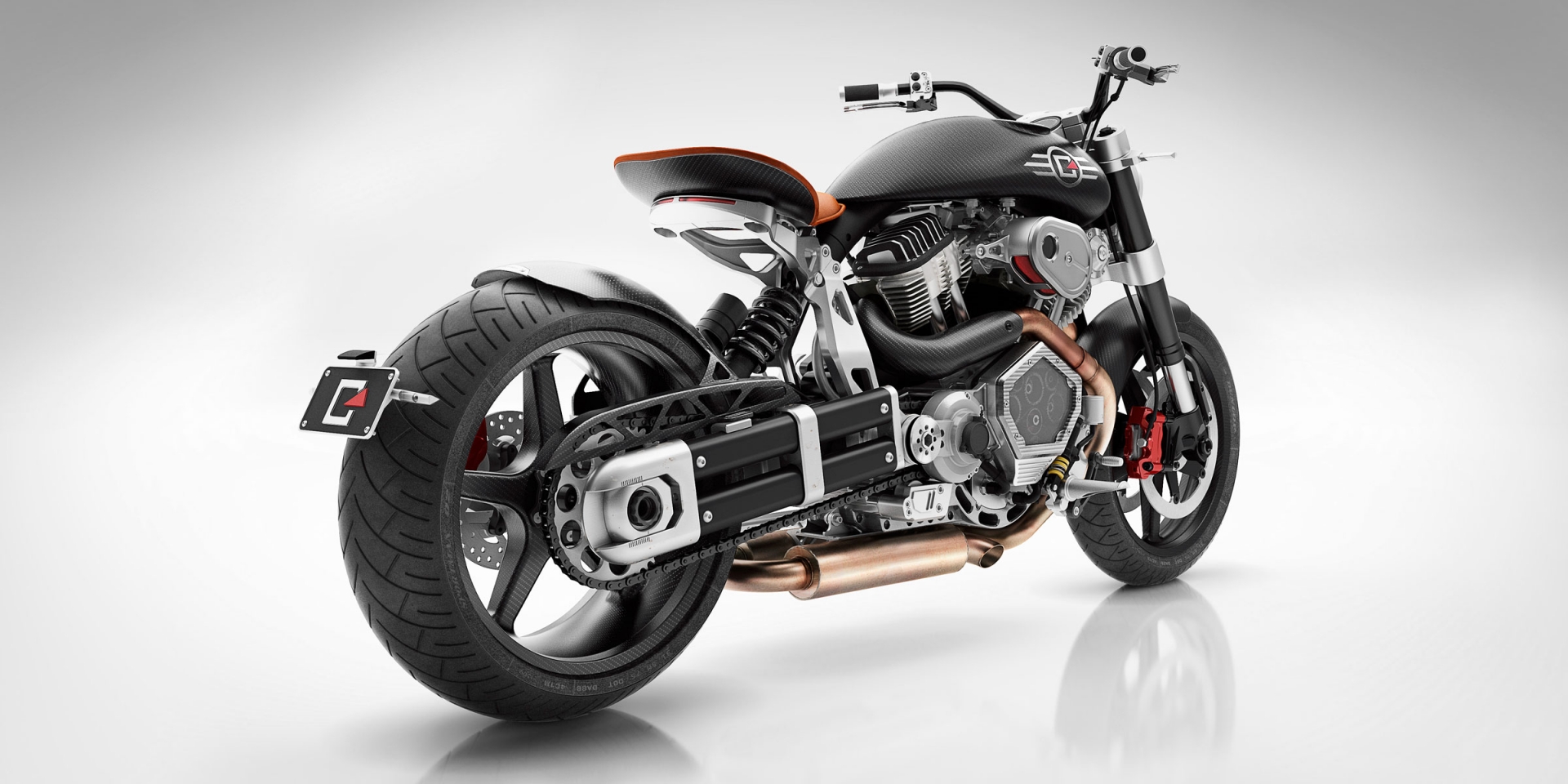 The bike sits on a custom suspension fork at the front and a custom coilover shock at the rear, both of which are adjustable. It features 18-inch BlackStone Tek carbon fiber wheels with a front width of 3.5 inches and a chunky rear width of 8 inches. Four-piston Aerotec calipers coupled with dual beringer Aeronal floating ductile iron rotors at the front and a cross-drilled Brembo stainless steel rotor at the rear help to keep a lid on things.