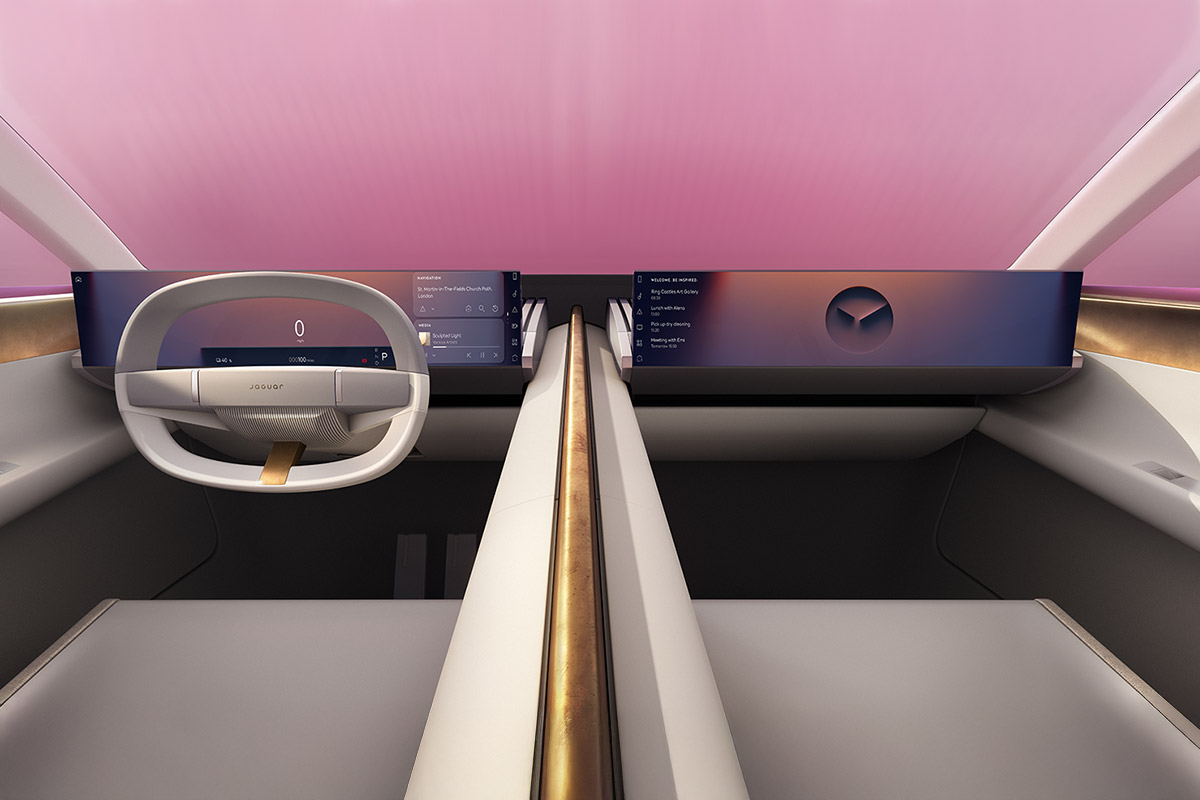 Gone is the curvaceous sensuality and feline aggression that Jaguars have long been known for, replaced with geometric forms, symmetry and simplicity for a very minimalist look. The interior is equally modernist, with dramatic butterfly doors, woven textile trim and brass and travertine stone highlights, as well as screens that deploy from the dash.