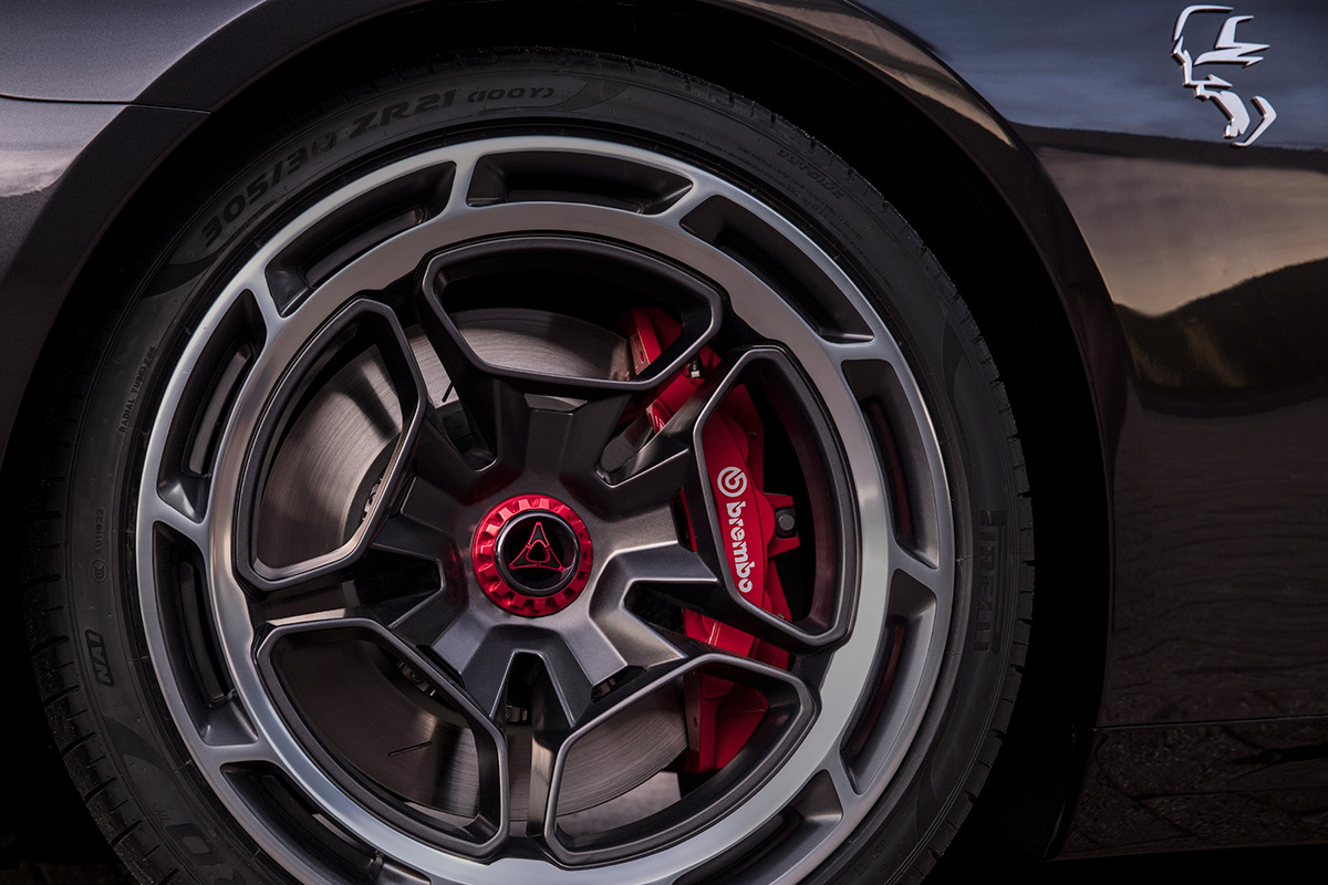 Painted-pocket 21-inch wheels with diamond-cut faces continue the aerodynamic efficiencies with a turbine-like design, and a red Fratzog logo embellishes the wheel center locks. Grey six-piston brakes provide the stopping power.