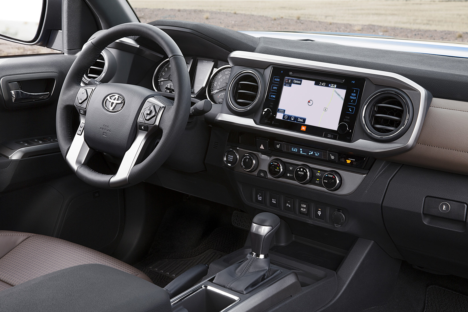 The 2016 Tacoma’s tough exterior is complemented by an interior that conveys a sport truck image reflecting an athletic, go anywhere, off-road feel. Once inside, drivers will notice a “handlebar” design theme in the instrument panel for a more driver-focused experience. Soft-wrapped trim and metallic accents set the stage for a high-quality look and feel that is a starting point for an array of available premium features.