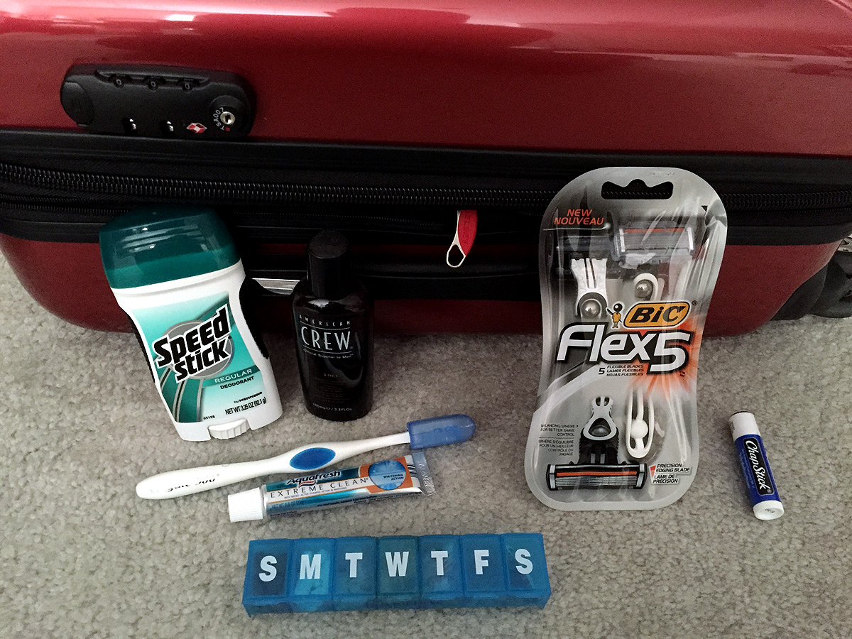 At a minimum, your shaving bag should contain a toothbrush, toothpaste, dental floss, mouthwash, shampoo, conditioner, soap/body wash, deodorant, razor, and shaving cream. Keep in mind that the TSA’s 3-1-1 liquids rule limits you to 3.4 ounces or less per container, so make sure the items you’re bringing are small enough, or they’ll confiscate them. Your local drugstore should have a dedicated section where they sell travel size toiletries, and they’re usually only $1 or so.