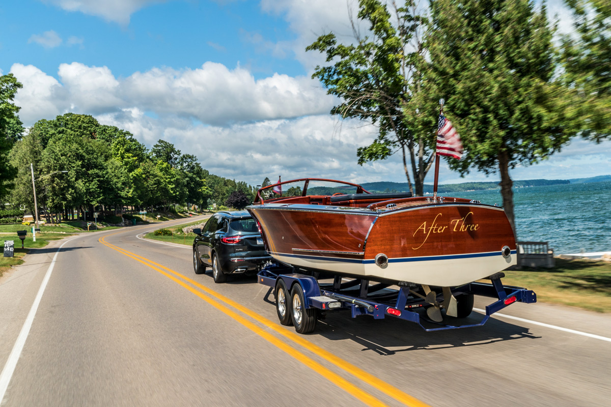 Pulling up to the Sommerset Pointe Yacht Club, there was a gorgeous mahogany boat sitting on a trailer in the parking lot. Turns out, the boat belonged to Van Dam, a renowned Michigan custom wooden-boat builder, and we were going to be towing this bad boy in a Buick Enclave Avenir, which has a towing capacity of 5,000 pounds. It was quite an experience, and I was thankful to make it back without incident!