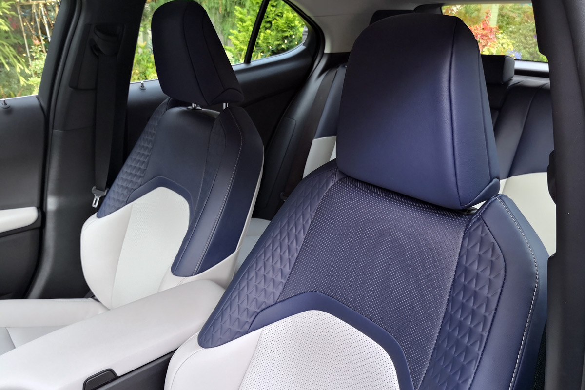 Speaking of the cabin, the interior of the UX what we’ve come to expect from Lexus, with high quality materials and a whisper-quiet ride. That said, this isn’t your grandfather’s Lexus. The UX is available with a two-tone lapis and birch (blue and white) interior, complete with washi-textured blue trim on the dash. I personally loved the look, but if that’s too radical for you, there are more traditional options to choose from as well.