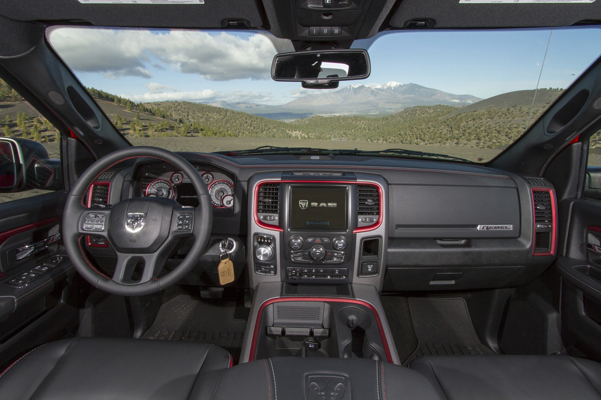 In addition, the Rebel package adds dual rear exhaust tips, an exclusive interior with tire-tread pattern seating and Rebel badges on the seats and floor. A host of other goodies added on brought our test model’s price tag up just over $53,000.
