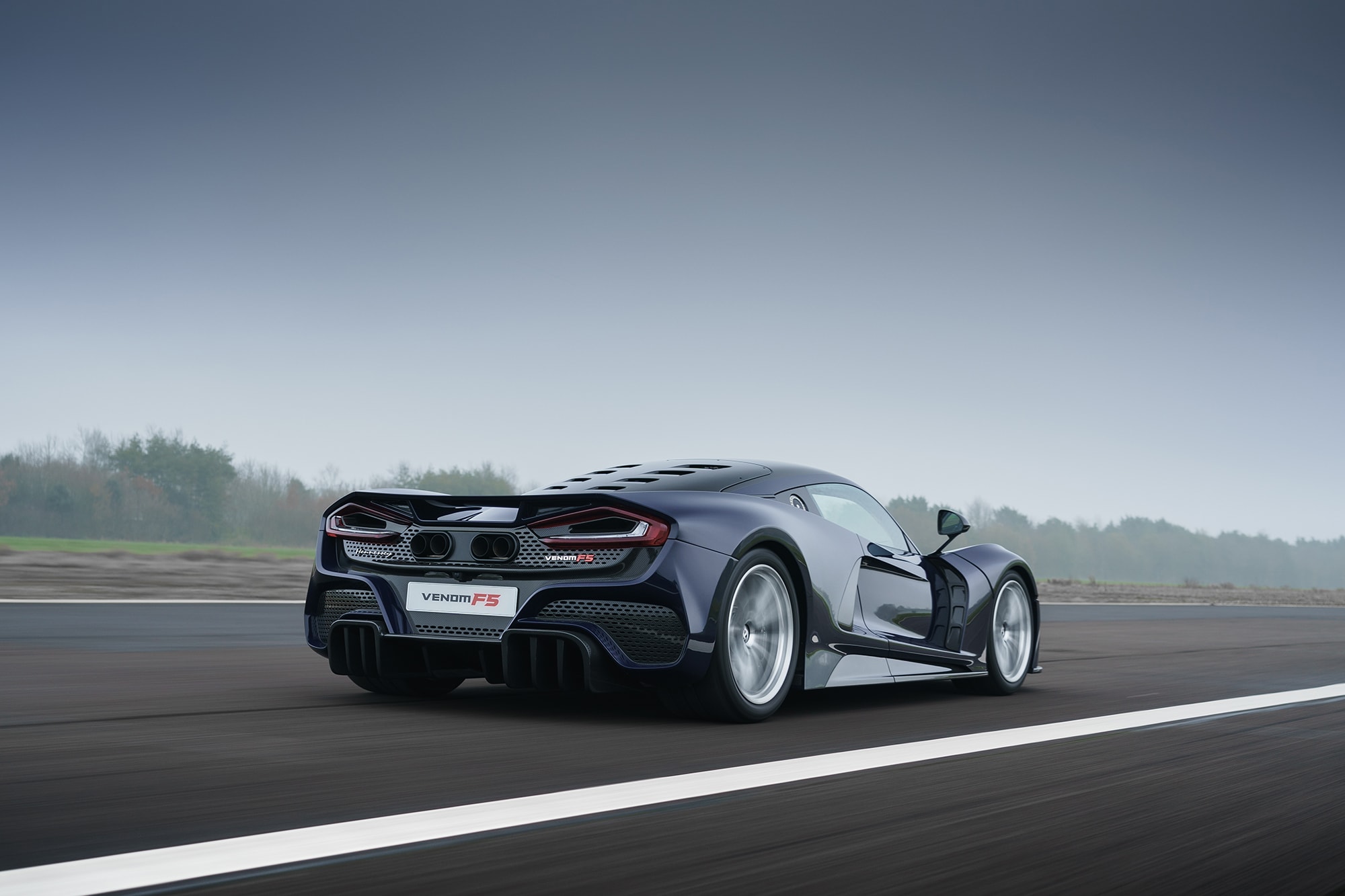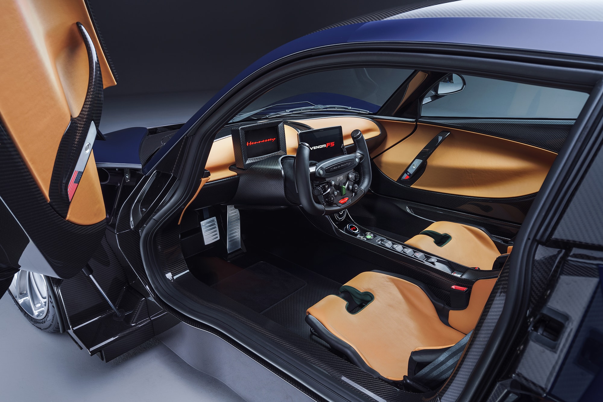The heart of the car is a Hennessey-built 6.6-liter twin-turbocharged V8 engine named ‘Fury’, which puts out 1,817 hp at 8,000 rpm and 1,193 lb-ft of torque. With the car only weighing in at 2,998 lbs, acceleration is lightning quick: 0-62 mph takes less than 3 seconds and it will run from 0-124 mph in under 5 seconds. That power-to-weight ratio is “well in excess of any road car available today,” and the F5 is targeting a top speed in excess of 311 mph.