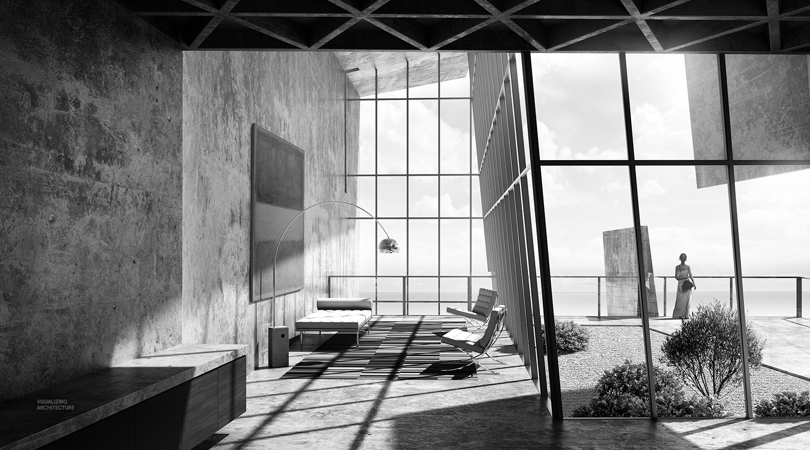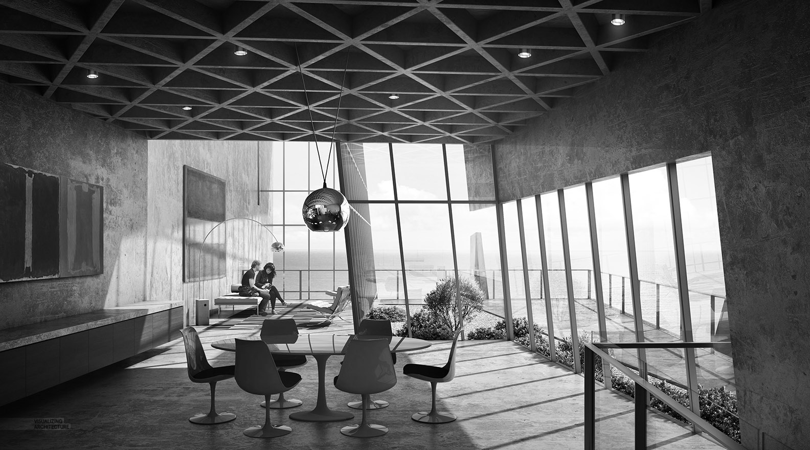Made out of clean and sharp concrete slabs and wrapped in primarily floor-to-ceiling glass panels, Alex’s idea is to maximize the panoramic views of the rocky coast, sky and sea, which depending on weather conditions, can range from sunny and postcard perfect, to gloomy and outright scary.
